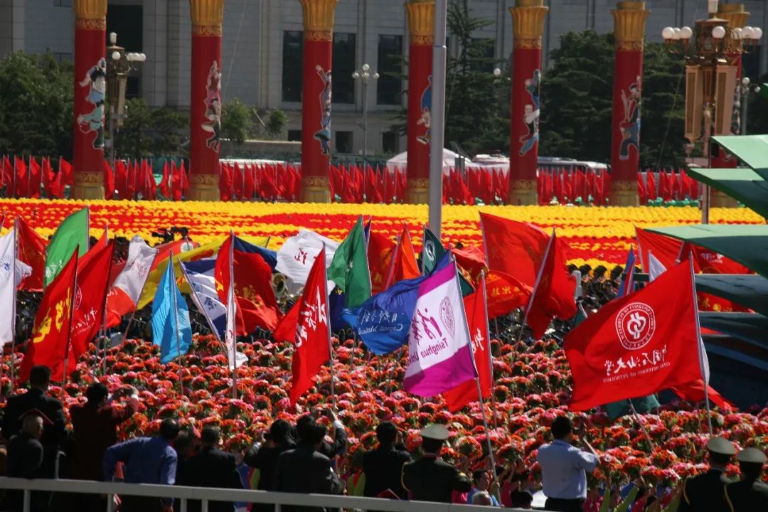 “入场时广场上正巧播放着熟悉的《我为祖国献石油》那动人的旋律,激动得我们这些石油学子更振奋不已。我校的场地被安排在高校联欢区中属于极佳的位置:位于国旗左侧,正对着天安门城楼,后面巍然屹立着人民英雄纪念碑。站在那里,洋溢着喜庆气氛的广场美景尽收眼底。