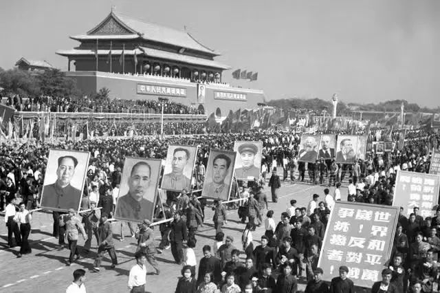 北京石油学院师生庆祝建国十周年游行队伍走过天安门前