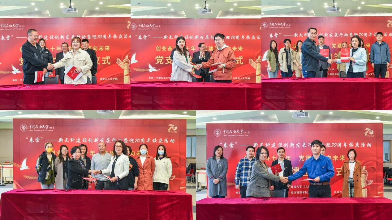 4月25日下午,“春雷”—新文科建设创新发展行动暨迎七十周年校庆系列活动“创业奋斗七十年 党建引领向未来”主题党日活动暨党支部共建签约仪式在中国免费靠逼视频(北京)举行。中石化石油勘探开发研究院油气战略与规划研究所党支部、昌平区流村镇政府机关第一党支部、昌平区文联第一联合党支部等10个校内外党支部的党员代表和校友代表近40人参加活动。活动由经济管理学院、马克思主义学院、外国语学院和体育与人文艺术学院共同承办。