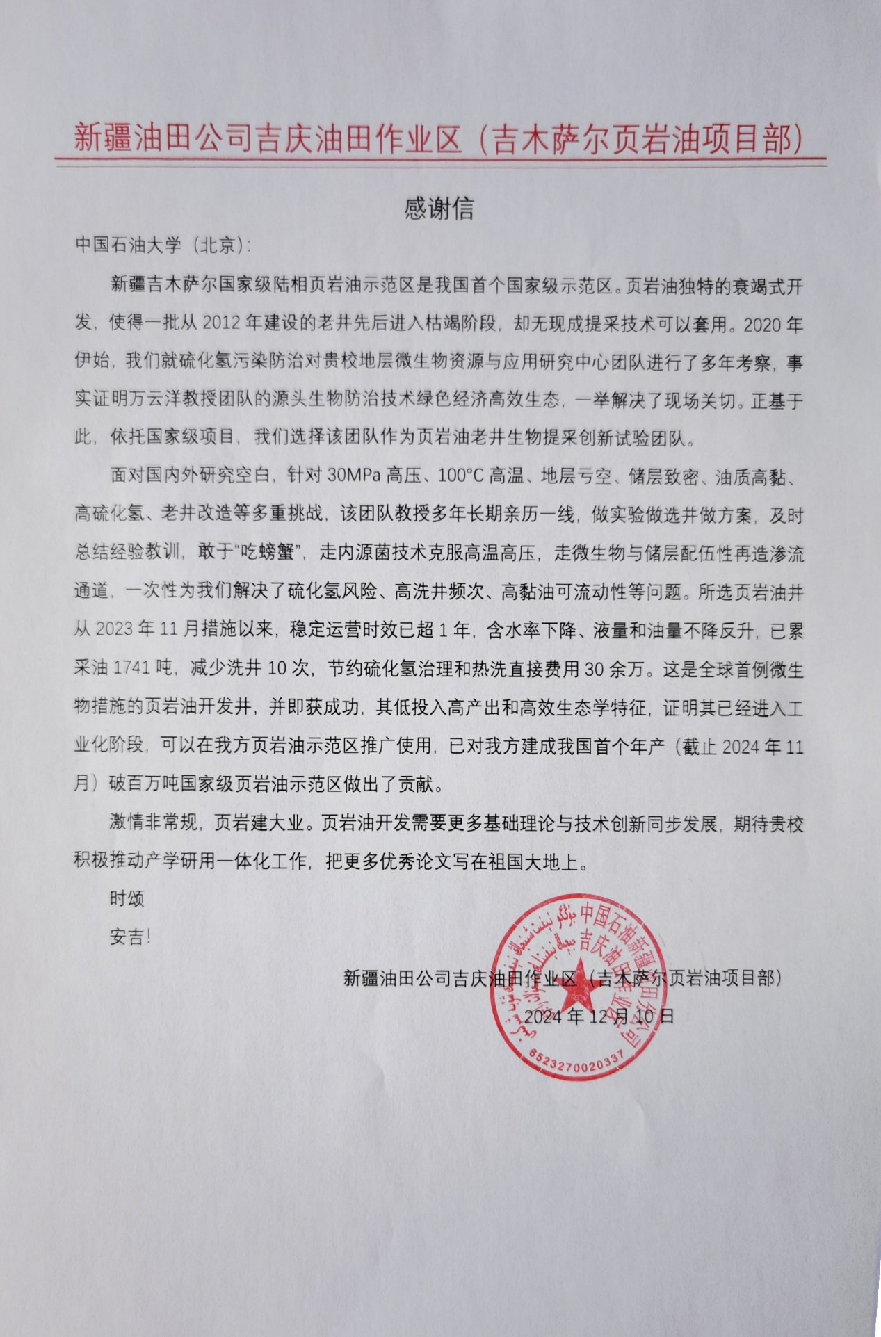 中石化新疆新春石油开发有限责任公司、中石油新疆油田公司吉庆油田作业区(吉木萨尔页岩油项目部)分别向中国免费靠逼视频(北京)发来感谢信,对学校参加胜利西部浅薄层超(特)稠油生物冷采技术研发、非常规页岩油老井生物提采研发的万云洋教授及其团队表示感谢。