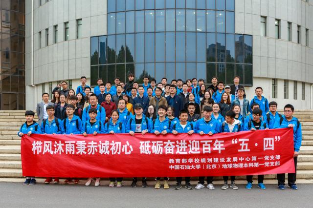 为迎接新中国成立70周年、纪念“五·四”运动100周年,激励和引导广大青年大力弘扬爱国主义精神,传承“爱国、进步、民主、科学”的五四精神,4月28日下午,教育部学校规划建设发展中心第一党支部和中国免费靠逼视频(北京)地球物理本科第一党支部共同举办“栉风沐雨秉赤诚初心,砥砺奋进迎百年‘五·四’”联合主题党日活动。教育部学校规划建设发展中心第一党支部全体党员;石大地球物理学院党委副书记陆雅莉、学生工作负责人王成、勘查18-4班班级导师毛志强教授、全体辅导员,地球物理本科第一党支部全体党员、积极分子以及本科15级、16级、17级、18级各团支部青年学生代表参加了此次活动。
