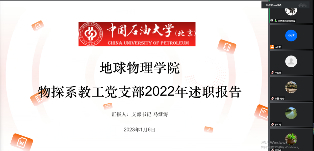 测井系教工党支部书记卢俊强、物探系教工党支部书记马继涛分别介绍了支部基本情况,讲述了校级样板支部工作重点任务“七个有力”推进情况,详细介绍了学习贯彻党的二十大精神、开展示范共建主题党日活动、党员教育培训管理等工作,并阐述了支部下一年的工作安排。
