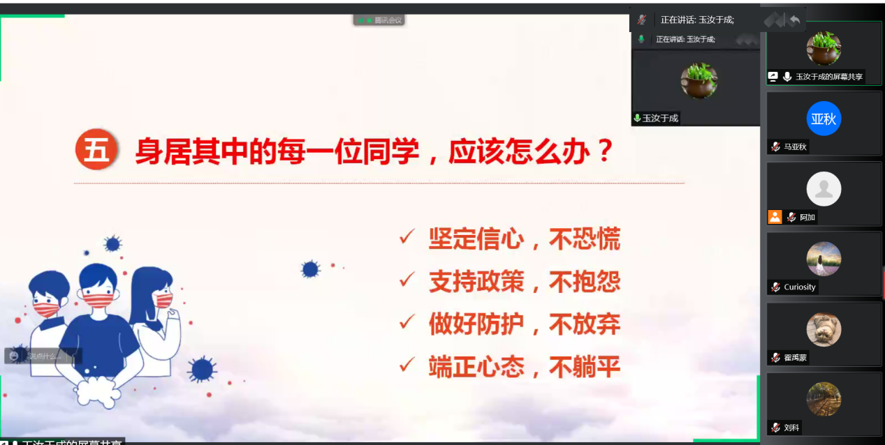 周玉成讲述了我国的国情及应对新冠疫情的救治原则与措施,并与国外的情况进行了对比,讲解了高校疫情防控变化的历程,指出了高校疫情防控的精准性、科学性,重点强调了个人应对新冠疫情的态度,呼吁各位同学做好个人防护,切实当好个人健康的第一责任人,为战胜疫情出一份力,发一份光。