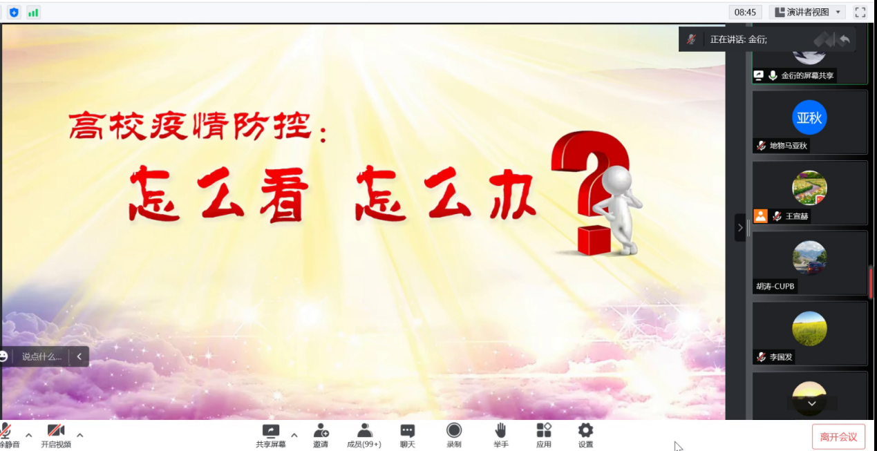金衍解释了面对新冠疫情不能躺平的原因,详细介绍了高校疫情防控的特殊性及措施的更新变化,讲解了面对疫情的具体做法,结合自身在东校园抗疫的经历,介绍了当前学校面临的形势,阐述了学校下一阶段的工作安排,动员各位教职工做好学生思想工作,及时关注学生动态、了解学生需求、解决学生问题,坚决守护校园安全,打赢疫情防控阻击战。
