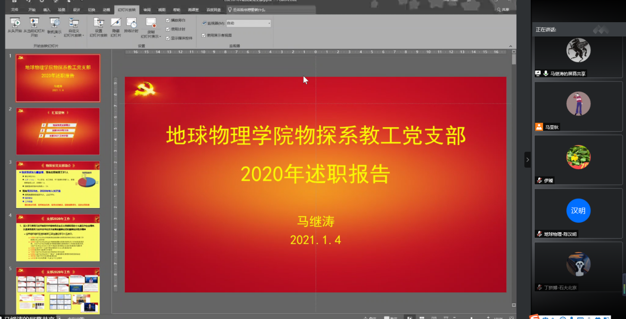党支部书记马继涛详细介绍了物探系党支部2020年开展的各项工作。认真开展组织生活,根据学校部署进行重点学习。配合学院党委做好疫情防控和教育教学等工作,深入推进课程思政建设,与本科学生党支部开展共建,制作完成牟永光教授的宣传视频和征文作品,用于党员的学习教育,共建活动项目获准立项。在学院党委的领导下,全面助力云南南华县脱贫工作,深入开展“党建进宿舍、帮扶促成长”活动,关心学生的成长发展。通过发挥基层党支部的引领作用,物探系科研和教学均取得喜悦成绩。