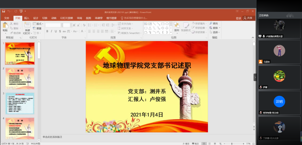 2021年1月4日,地球物理学院通过腾讯会议线上平台召开2020年度教师党支部书记述职评议考核会议,学院领导班子、各系系主任、各教师党支部委员均参与了本次会议,会议由学院党委书记陆雅莉主持。