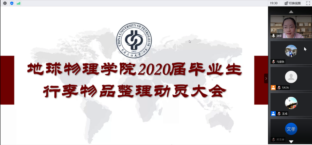 为了做好毕业生行李物品整理工作,6月28日上午,地球物理学院通过腾讯会议线上平台召开了2020年第一次教职工大会暨毕业生行李物品整理动员大会,学院全体教职工参加,院党委书记陆雅莉主持会议。