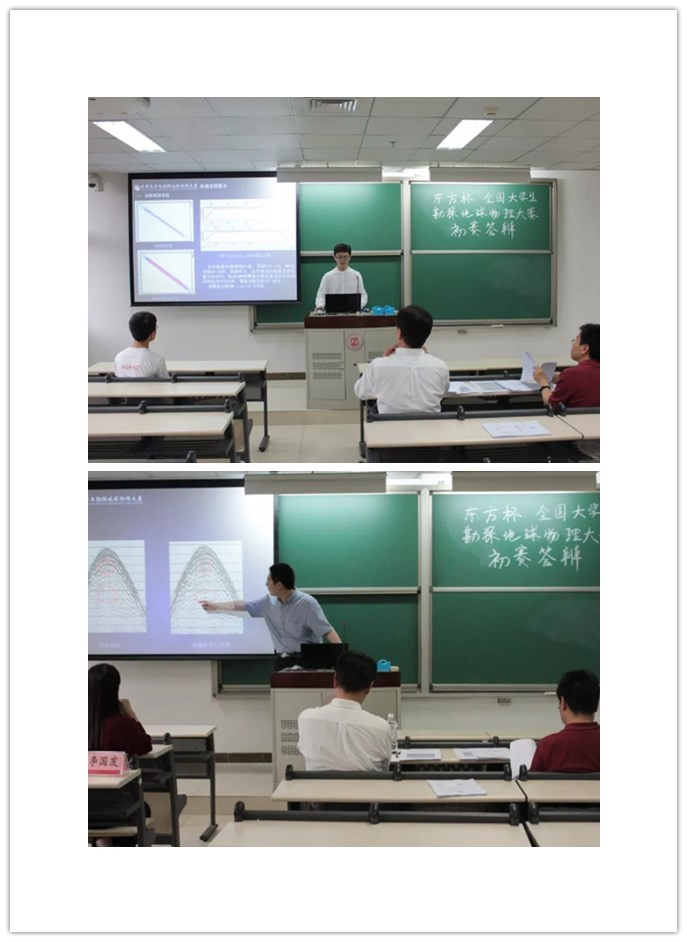 17日下午14:00-16:00,初赛答辩在第四教学楼举行。答辩专家组由王润秋、李国发、宋炜、安勇、马继涛、刘国昌六位老师组成。答辩过程由7分钟的PPT讲解演示和3分钟的评委提问组成。答辩不仅是对参赛队伍知识、工作的检验,也是对参赛选手素质的一个检验。每支队伍准备充分、饱含激情,从原始资料分析、处理流程、参数选择、质量监控和最终成果剖面评价等方面汇报成果,并认真回答评委老师的问题。评委老师认真倾听,系统提问并与选手们进行了深入交流,同时高度评价参赛选手的作品。
