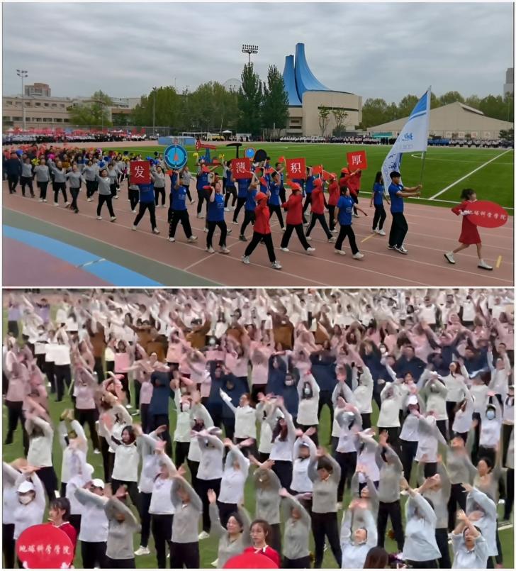 开幕式上,学院代表队着装整齐,喊着嘹亮的体育精神口号,展现出地学人积极进取、昂扬向上的精神面貌。在第九套广播操表演环节,教职工们伴随轻快的节奏,动作整齐划一,洋溢着青春活力。