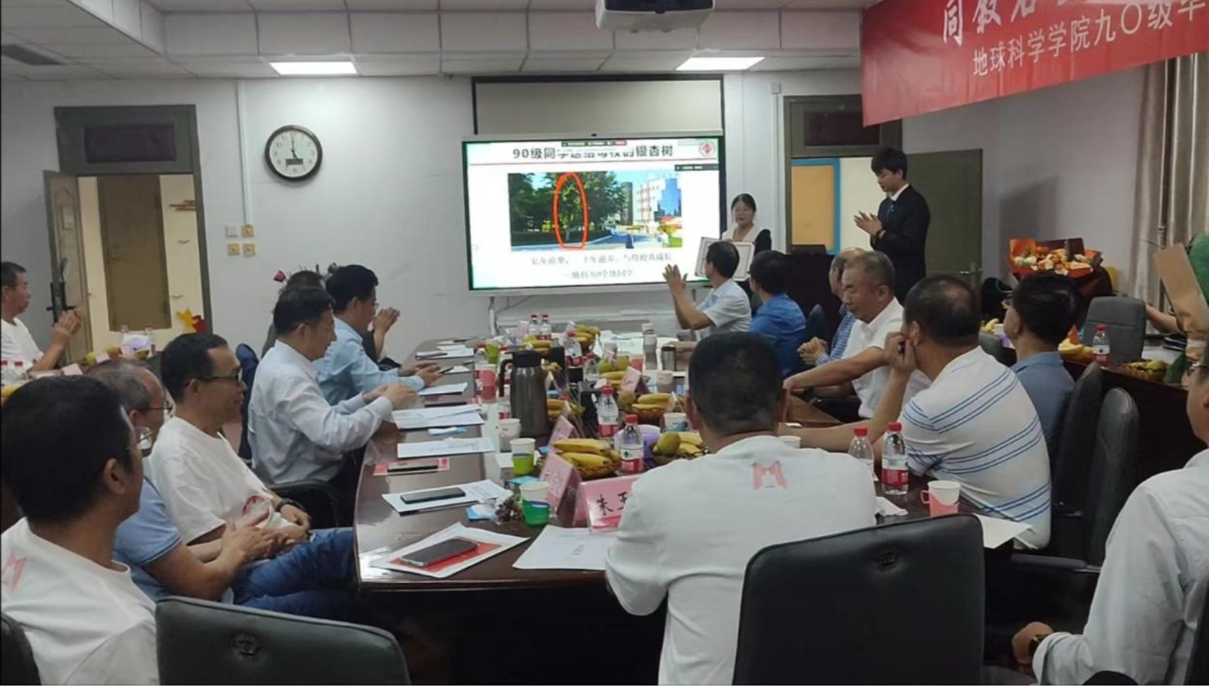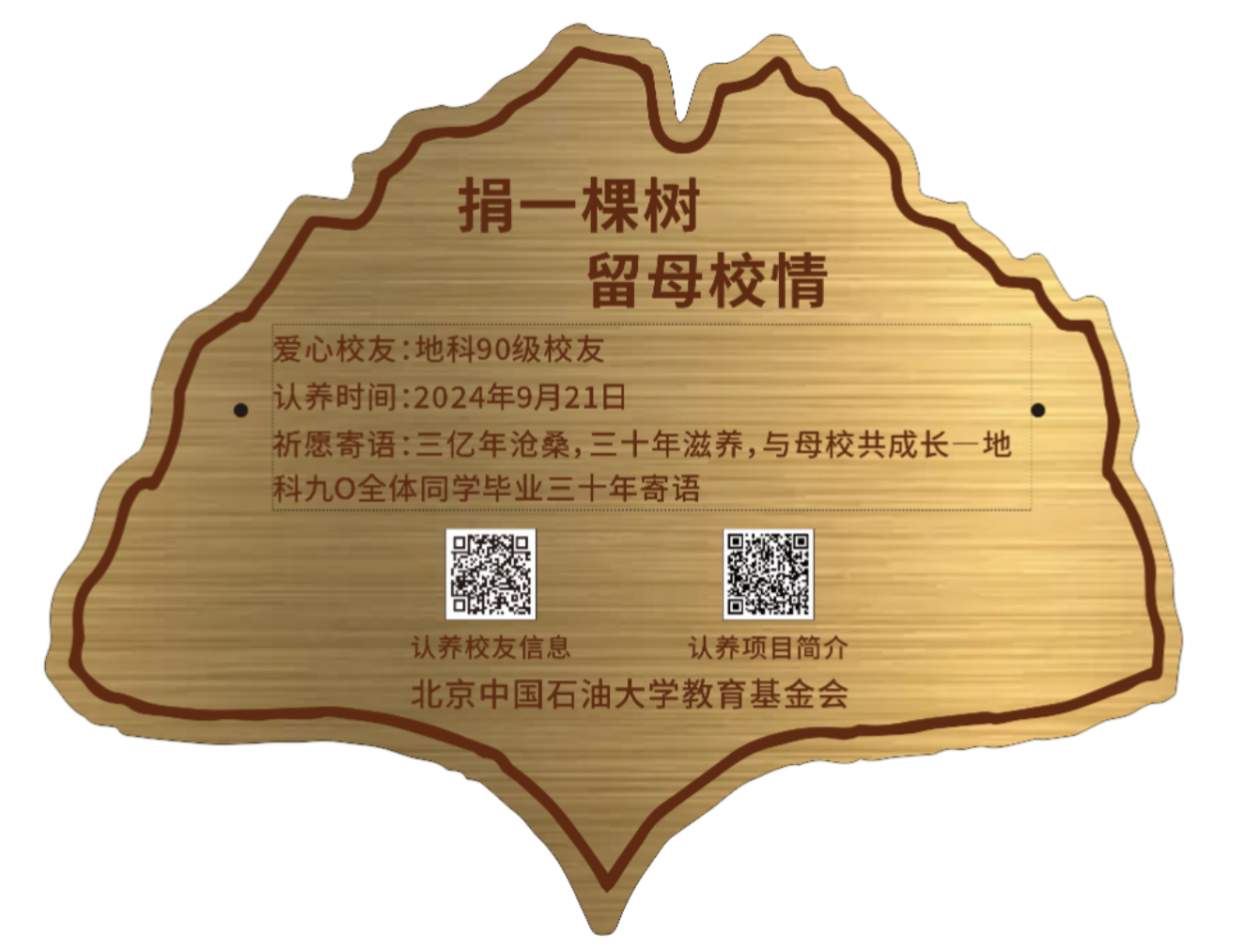 地科90校友们为母校捐赠银杏树一棵,并赠言:三亿年沧桑,三十年滋养,与母校共成长。