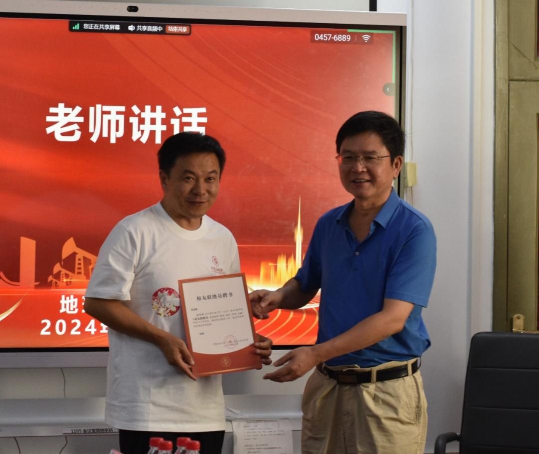 季汉成教授为刘成林颁发校友联络员聘书。为其做出的工作给予肯定。希望按照“联络、服务、发展、共赢”的工作宗旨,做好校友联络工作,促进母校和校友事业共同发展。