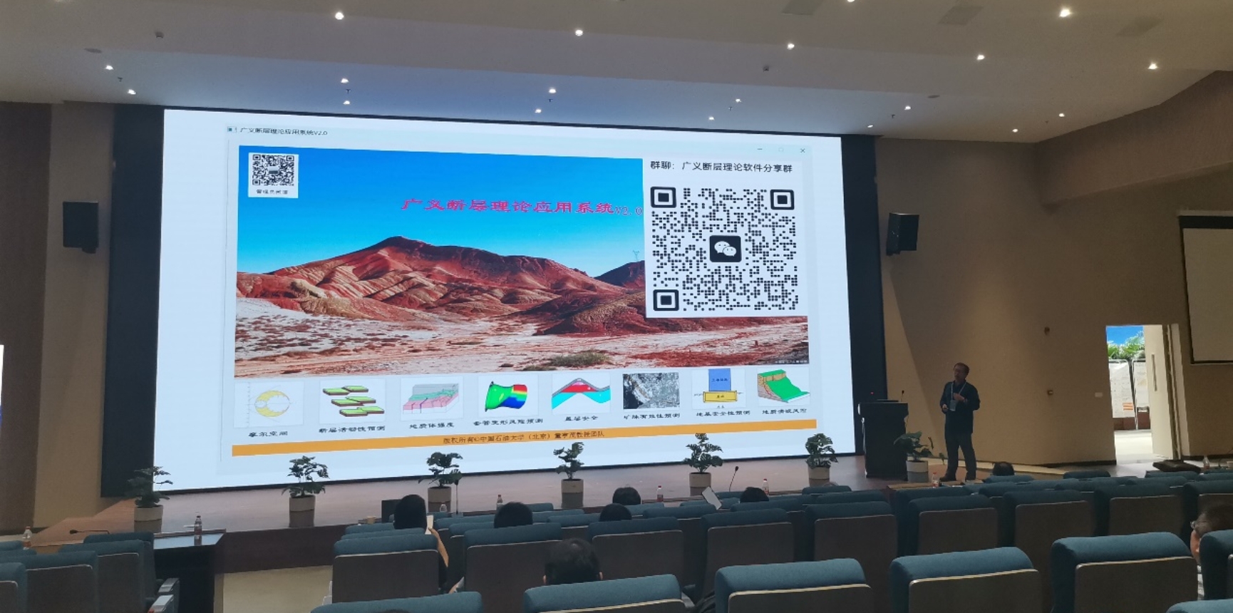 童亨茂教授在作两个特邀报告(“广义断层理论重大影响的应用案例”和“断层作用若干问题新认识”)的基础上,在会议上首次向地质学界公开“广义断层理论应用系统v2.0”软件,并郑重宣布将该软件面向学术界无偿提供使用权限。