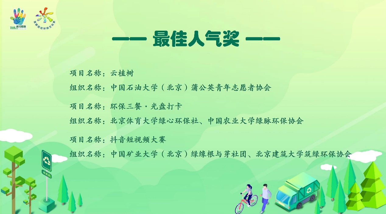 12月19日,第十七届首都高校环境文化季在北京市生态环境保护宣传中心完美落幕。在本届环境文化季中,中国免费靠逼视频(北京)蒲公英青年志愿者协会举办的“云植树”活动在12项环保实践活动中脱颖而出,荣获“最佳人气奖”。蒲公英青年志愿者协会成员胡深宇、岳文婧在50多所高校及环保社团的近万名参与者中荣获“首都高校环保卫士”称号,该奖项获得者仅有30人。