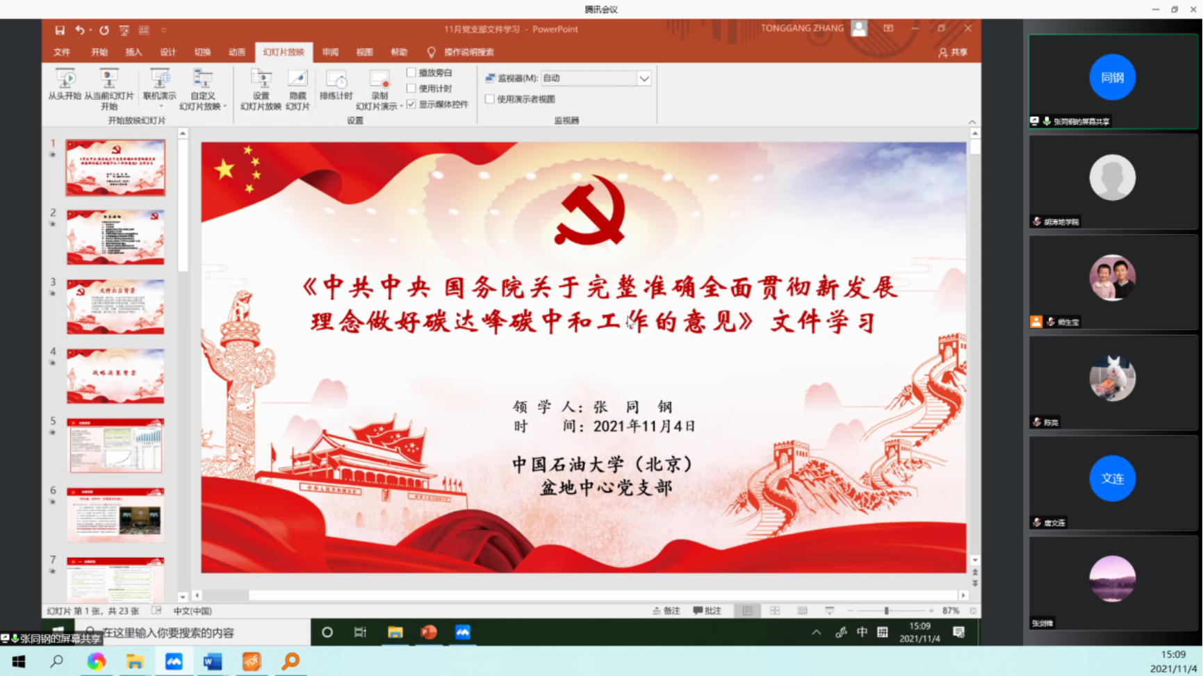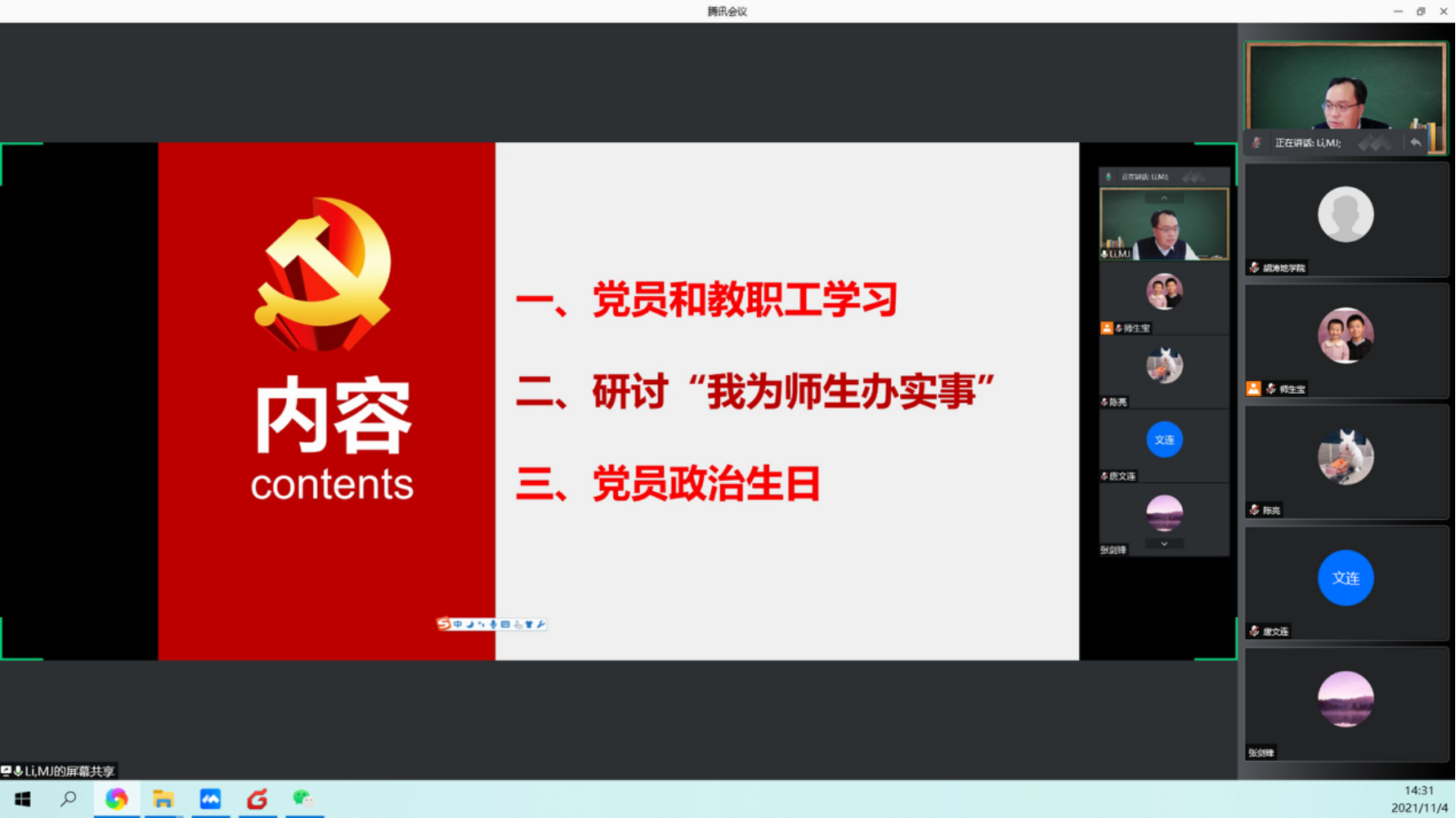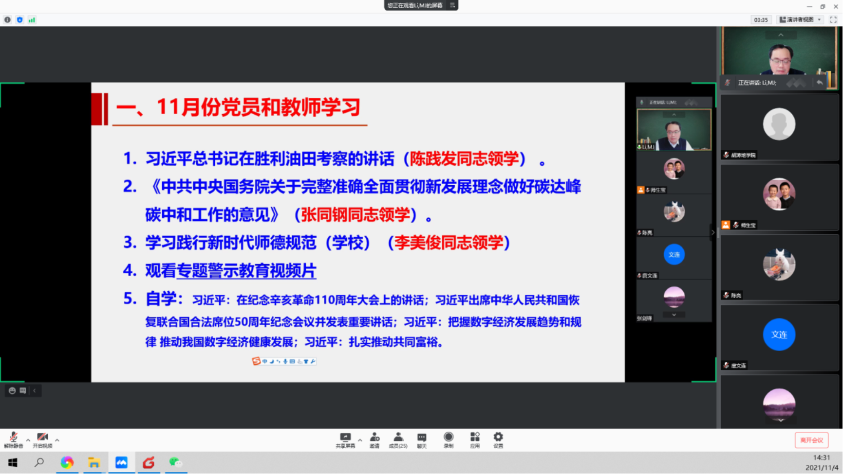 2021年11月4日下午,盆地与油藏研究中心教工党支部组织全体教职工线上进行了党员和教师理论学习,共有35位党员和教职工参加了本次学习和研讨,会议由李美俊同志主持,会议共分为三个阶段。