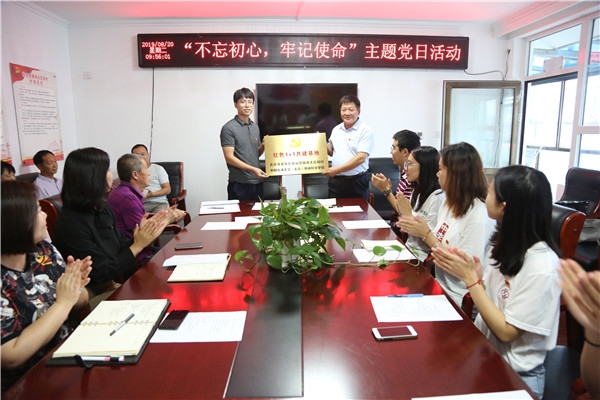主题党日活动中,地学院研18-1党支部为西大庄科村党支部授予“红色1+1”共建基地牌匾。双方党员齐唱《国歌》,重温入党誓词,并围绕“不忘初心、牢记使命”主题分别发言。