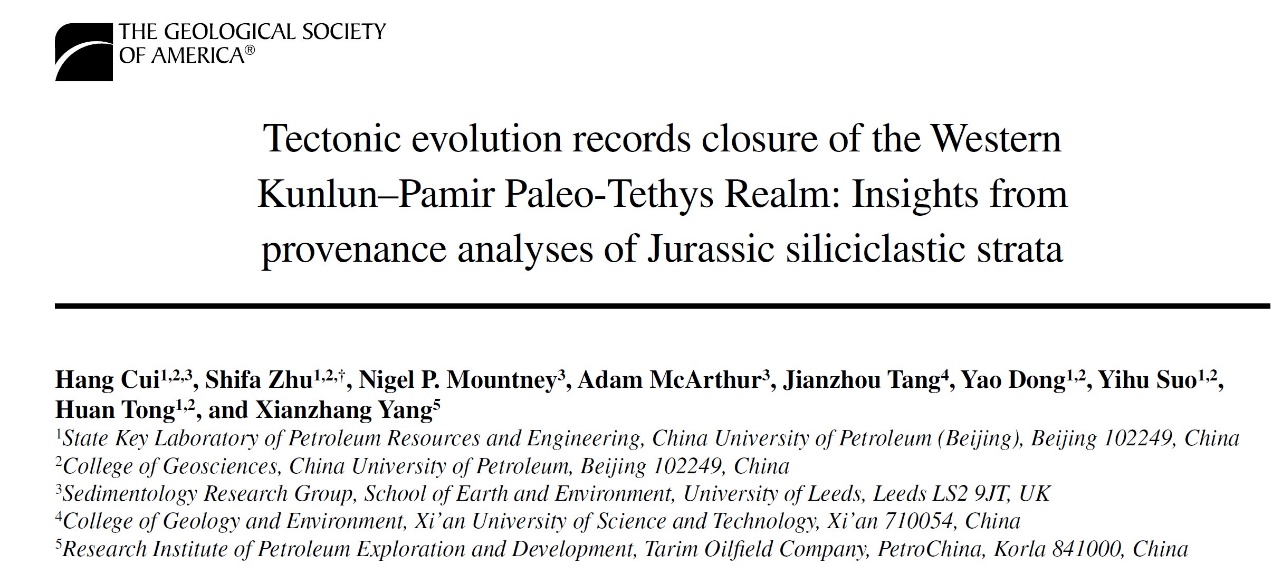 该成果与英国利兹大学Nigel Mountney教授和Adam McArthur博士以及塔里木油田合作完成,成果论文《Tectonic evolution records closure of the Western Kunlun–Pamir Paleo-Tethys Realm: Insights from provenance analyses of Jurassic siliciclastic strata》发表在地学领域著名期刊《GSA Bulletin》上。论文第一作者为我院博士生崔航,通讯作者为朱世发教授,中国免费靠逼视频(北京)油气资源与工程全国重点实验室和地球科学学院为第一完成单位。《GSA Bulletin》是地球科学领域的中科院1区top和JCR Q1期刊,具有重要的学术影响力,五年平均影响因子为4.4。