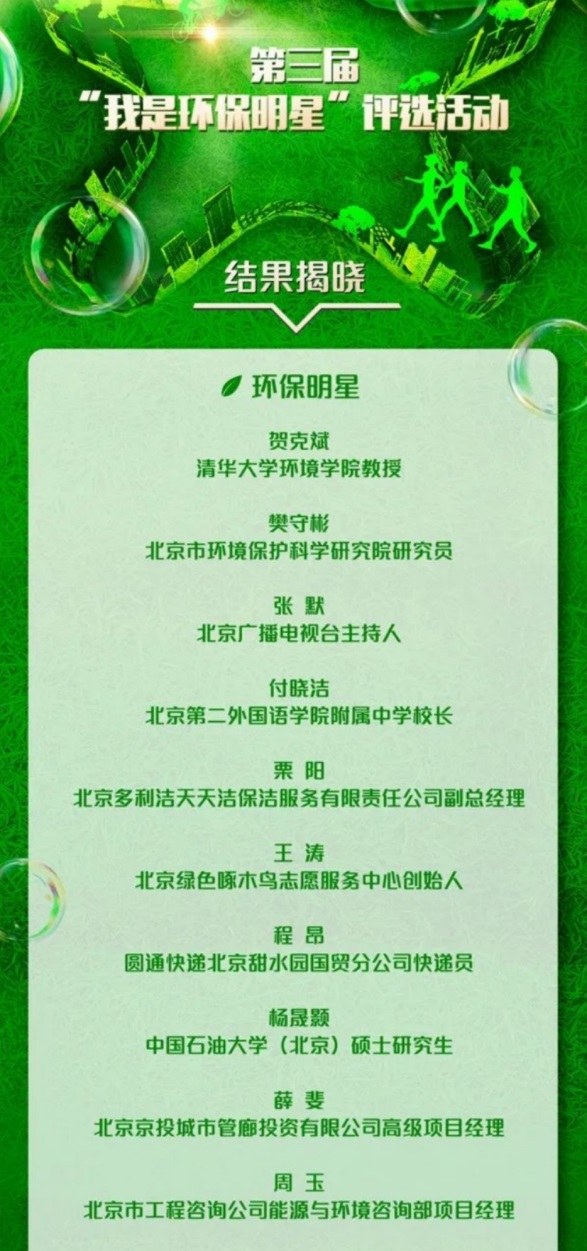 第三届“我是环保明星”评选活动历时两个月,活动通过网络海选、单位推荐等多种渠道面向全社会广泛征集,吸引了来自社会各界的逾1000名个人、近500个集体报名参加。活动组委会按照活动评选标准,遴选出30名“环保明星”候选人和30个“环保明星集体”候选集体,并对候选名单进行网络公示,邀请广大网友投票点赞。评选活动累计收获投票近300万人次,最终结合专家评审和网友投票评选出十大“环保明星”和十大“环保明星集体”。