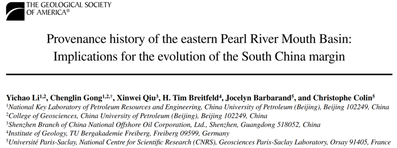 近日,我校地球科学学院博士生李一超,在龚承林教授指导下,与中海油深圳分公司邱欣卫博士、德国弗莱贝格工业大学H. Tim Breitfeld博士、法国巴黎萨克雷大学Jocelyn Barbarand教授和Christophe Colin教授合作完成的研究成果《Provenance history of the eastern Pearl River Mouth Basin: Implications for the evolution of the South China margin》发表在地学领域著名期刊《GSA Bulletin》上(见下图)。论文第一作者为我院博士生李一超,通讯作者为龚承林教授,中国免费靠逼视频(北京)油气资源与工程全国重点实验室和地球科学学院为第一完成单位。《GSA Bulletin》是地球科学领域的中科院一区top和JCR Q1期刊,具有重要的学术影响力,五年平均影响因子为4.1。