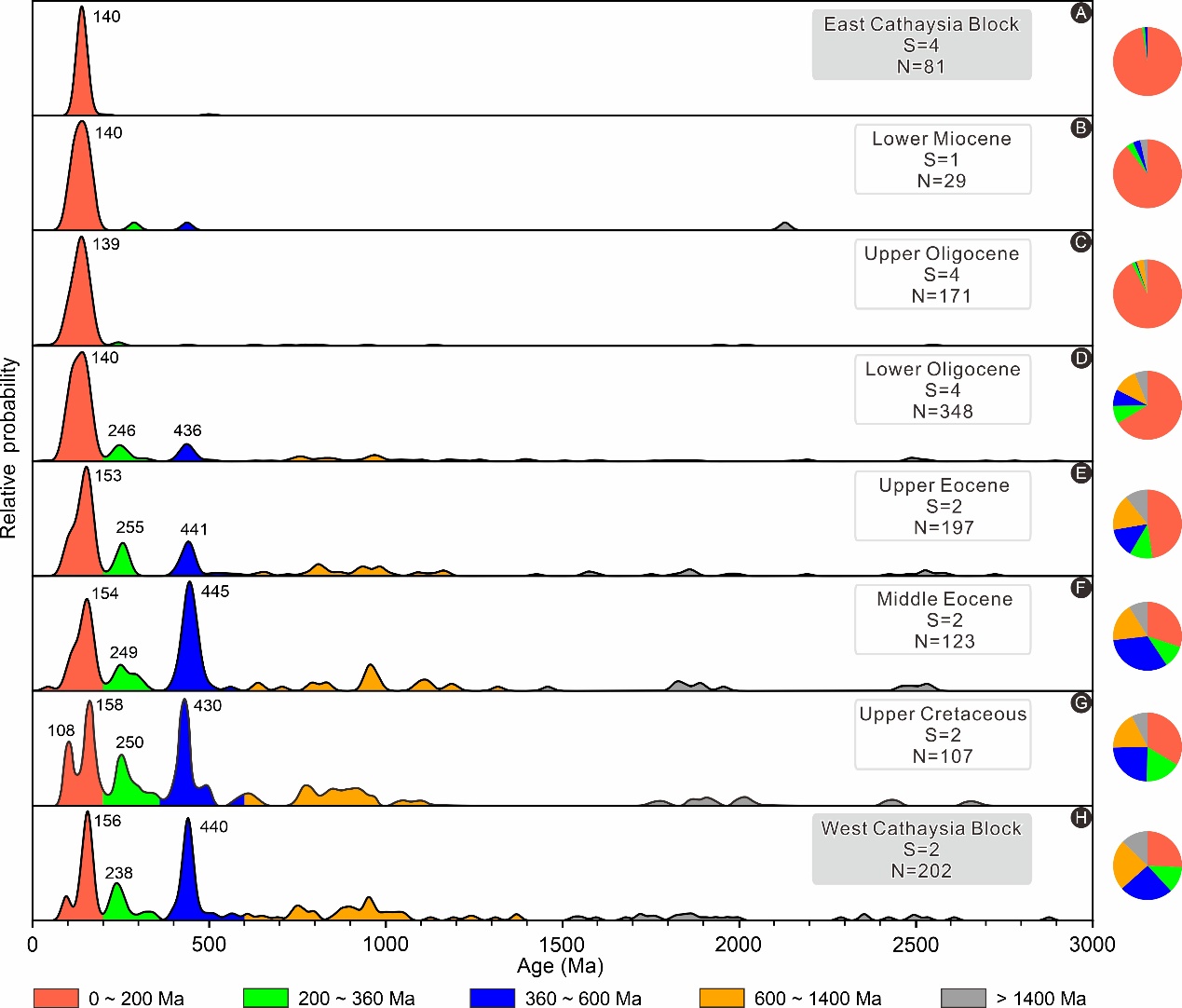 作为西太平洋俯冲体系的重要组成部分,华南陆缘自中生代以来发生了基底再活化、华南沿岸山脉隆升、古南海消亡以及南海扩张等重要地质事件。华南陆缘整体经历了由安第斯型主动陆缘向被动陆缘的转换过程,对华南陆缘沉积盆地的构造-沉积演化产生了重要影响。近年来对于珠江口盆地东部前新生界沉积岩的地质发现,填补了华南陆缘前新生代沉积记录的缺失。珠江口盆地东部连续的沉积记录是解译华南陆缘由构造动力过程的重要突破口。研究团队识别了珠江口盆地东部独特的“由繁到简”的锆石U-Pb年龄变化规律(见下图),建立了珠江口盆地东部关键物源变化与华南陆缘演化的成因关联,揭示了华南陆缘从古太平洋期、古南海期到南海期的3阶段构造动力过程。白垩纪华南陆缘东部处于古太平洋构造期,古太平洋板块俯冲形成安第斯型大陆边缘,弧前盆地沉积物主要来自于华夏地块加里东期基底和燕山期岩浆弧;古新世-始新世华南陆缘东部处于古南海构造期,古南海俯冲致使华南陆缘形成拉张环境,裂陷盆地沉积物来自于盆内基底;渐新世至中新世华南陆缘东部处于南海构造期,南海扩张促使华南陆缘进入拗陷环境,拗陷盆地沉积物主要来自于盆外远源。研究成果对深化认识华南陆缘由主动陆缘向被动陆缘的转换过程与动力机制具有启示意义。