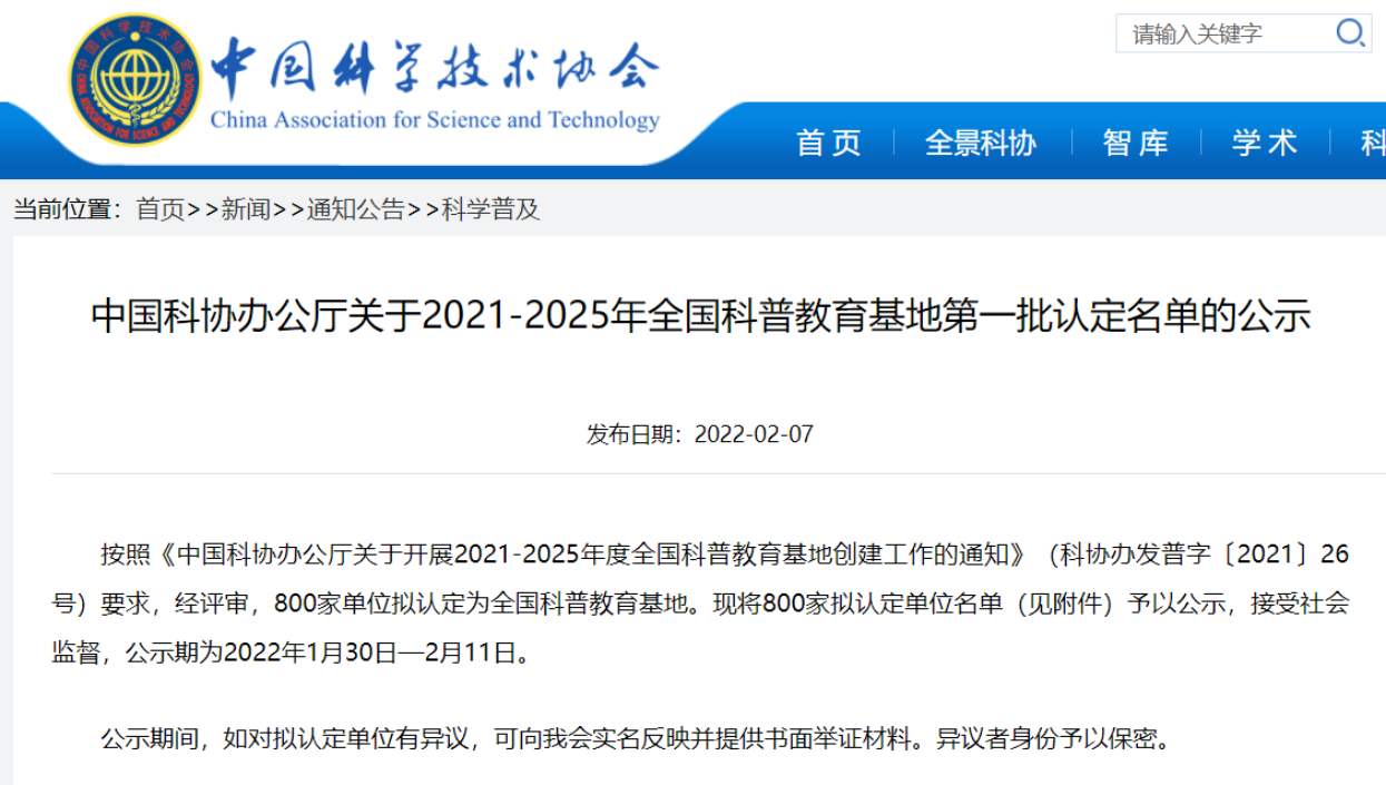 《中国科协办公厅关于2021-2025年全国科普教育基地第一批认定名单的公示》