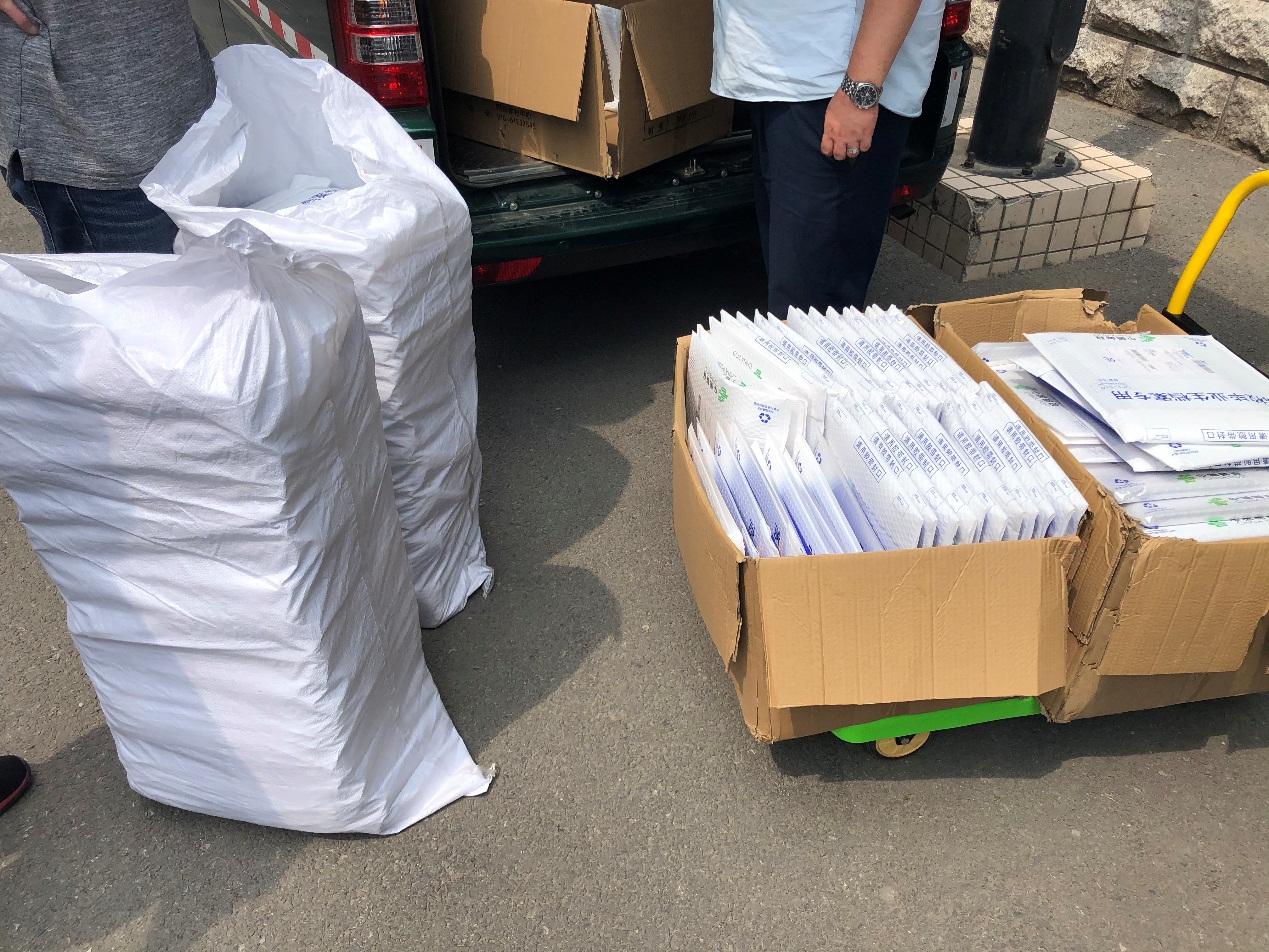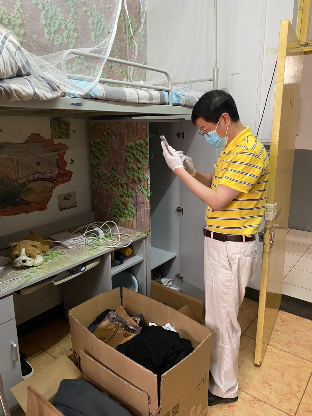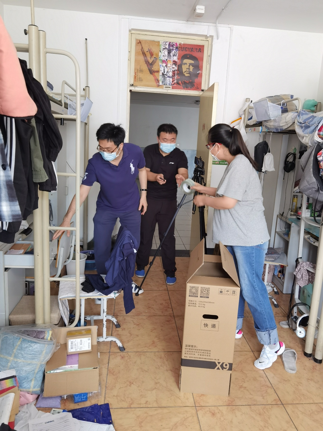 上午八点半,参与打包的各位老师就早早来到润杰公寓楼下,有的推着小推车,有的拿着编织袋,有的拿着打包箱,大家各司其职干劲十足。老师们一边和远在家中的学生视频连线,一边帮学生收拾行李。“这个衣服需要吗?”“这个笔记本是不是装上?”老师们充分征求学生们的意见,大到被子、椅子,小到笔筒、剪刀,都事无巨细地为毕业生们查找和确认,确保物品准确无误、完整无缺。