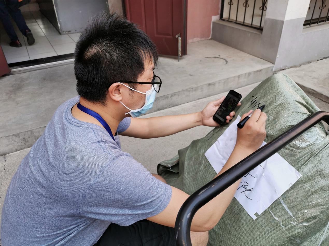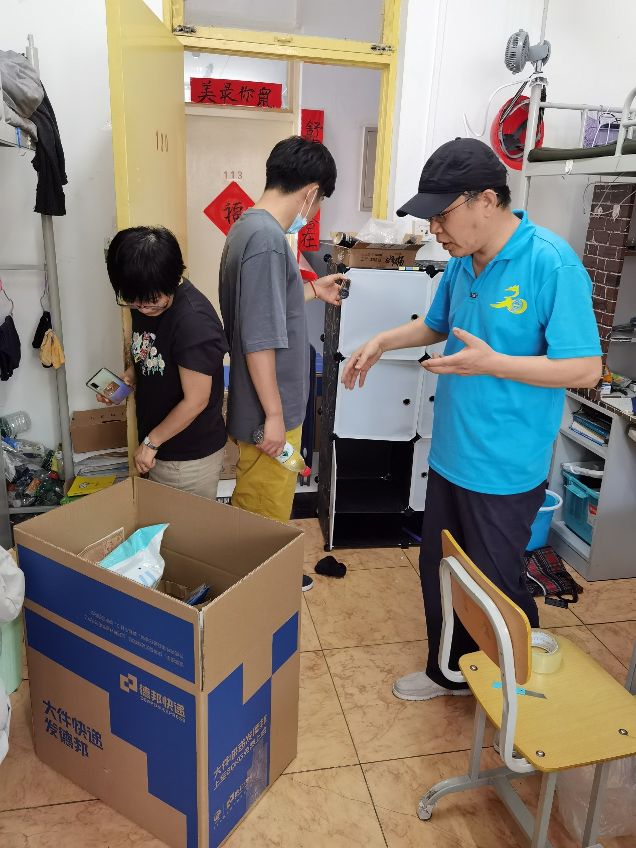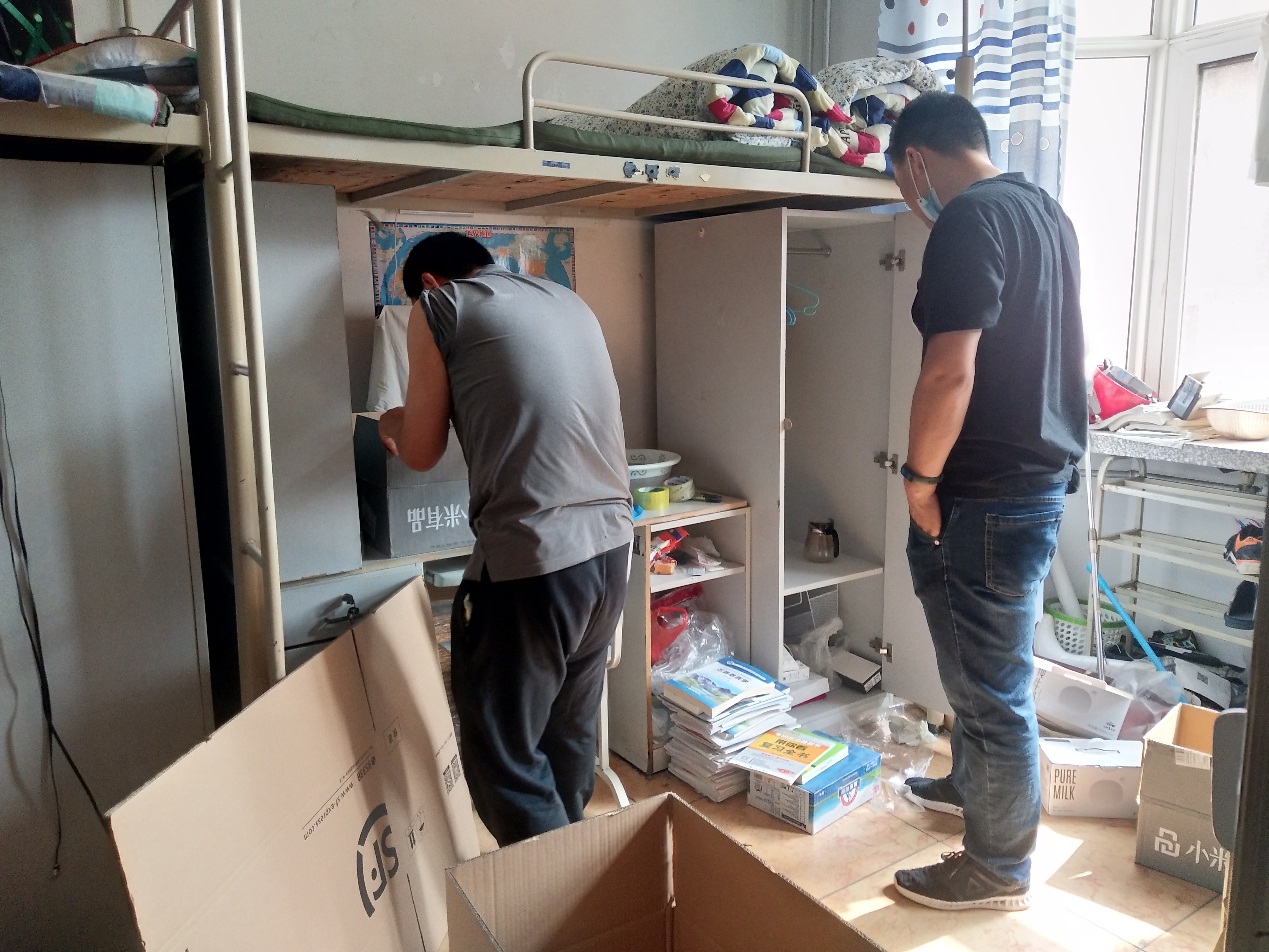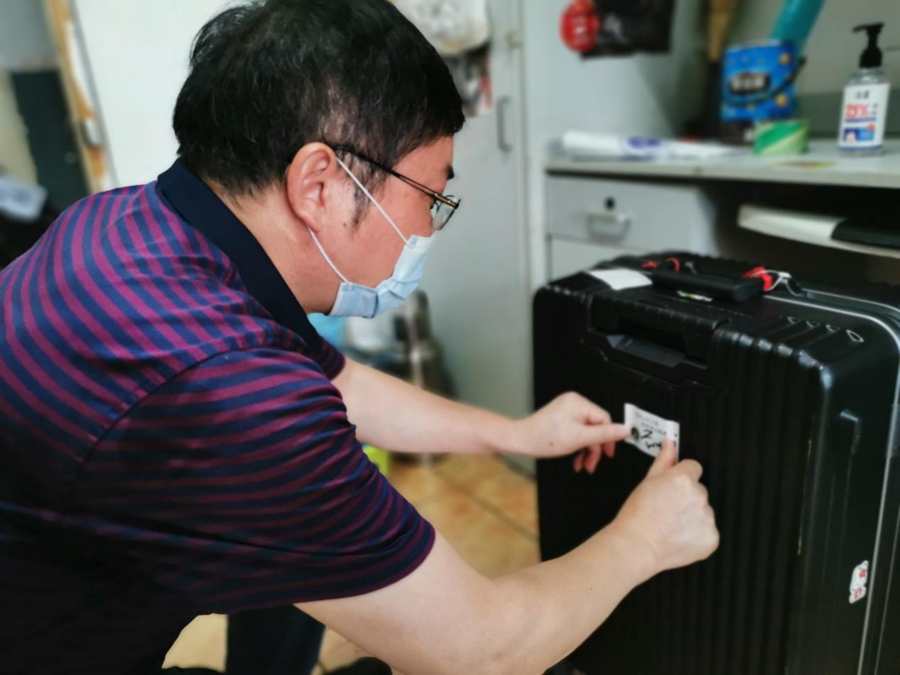 打包完成后,老师们细心地在行李上写上了学生们的姓名和住址,避免在运送的过程中出现差错。宿舍内空间较为狭小,天气较为炎热,行李打包起来也格外费时费力,没一会儿老师们已经汗流浃背了。
