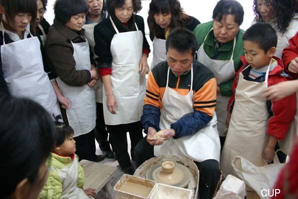 此次活动包括三个版块,首先来到放映厅,大家在这里观看《万千情节话瓷器》专题片,学习了陶瓷知识,了解中国瓷文化的精湛工艺及悠久历史,欣赏精美的陶瓷工艺品。之后进入彩绘间,大家用五彩的画笔在白色的毛坯盘上尽情发挥自己的想象力,任意地涂鸦,描绘出各种各样的图案。最后到了拉坯间,在陶艺师傅的指导下,自己亲自动手,用拉坯机制作了一件件虽然不太精致,但却寄予无限希望的作品。大家亲自作了一回“陶瓷艺人”,每个人的脸上都荡漾着满足的笑容。