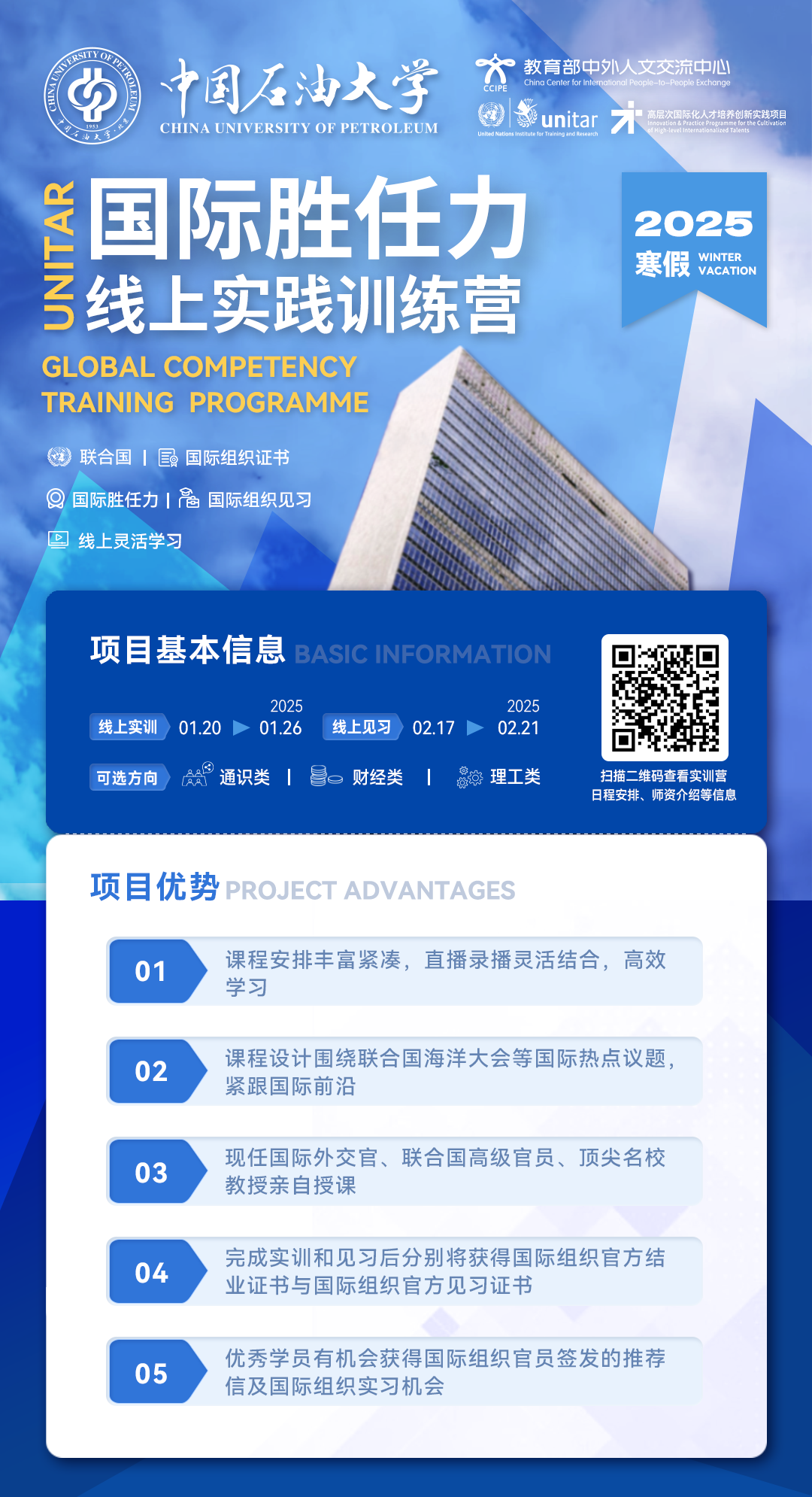 为加快培养具有全球视野和国际胜任力的高层次国际化人才,学校已开设了全球能源治理微专业,并推出了国际胜任力提升工程。根据教育部中外人文交流中心相关文件精神,现学校拟面向全校学生推出“2025年国际胜任力线上实训营”。