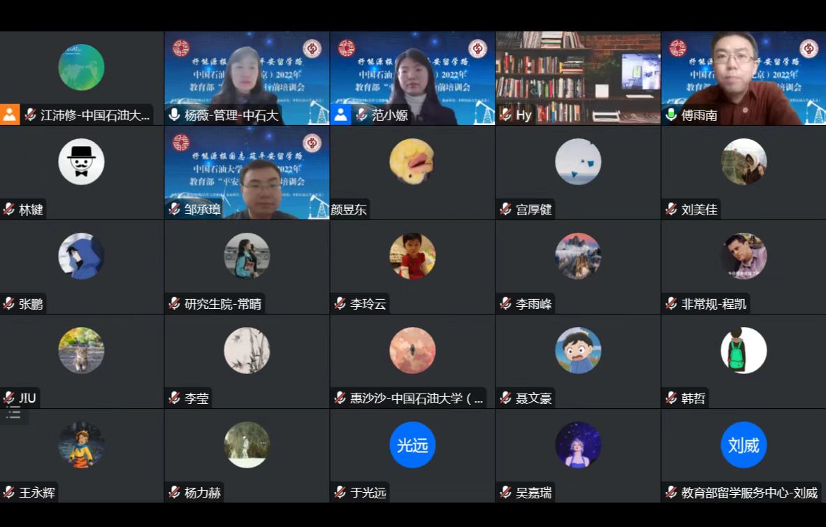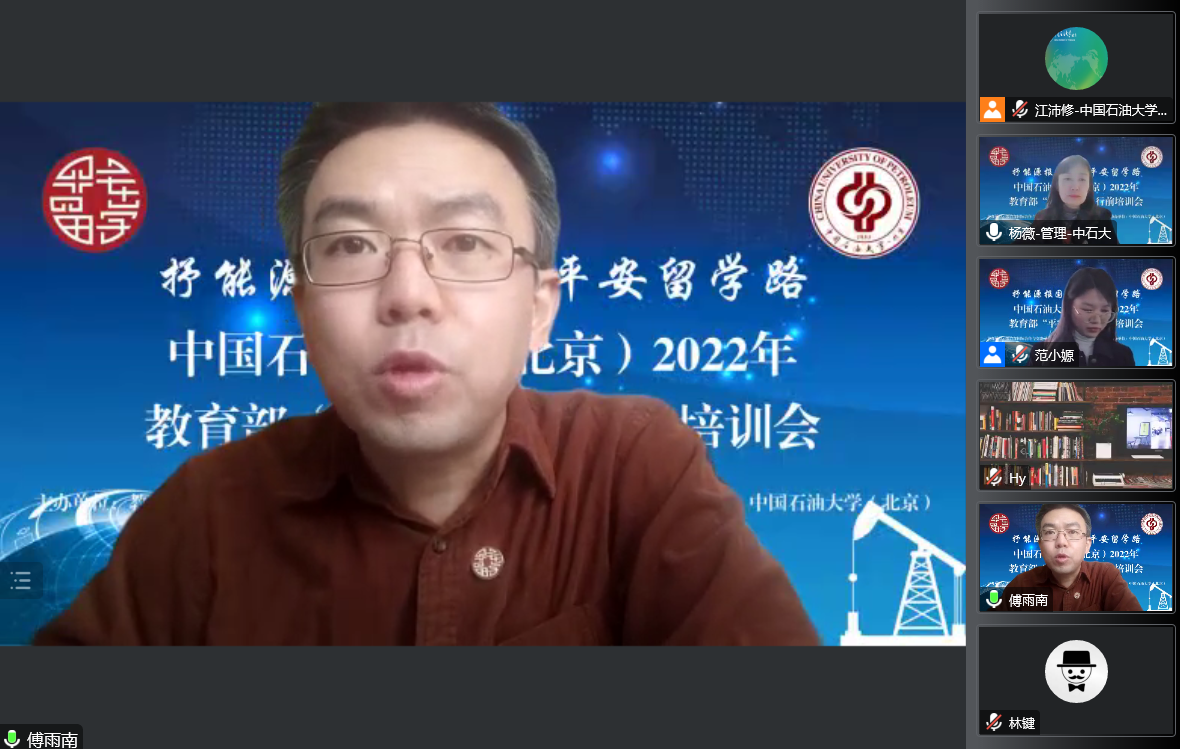 由教育部国际合作与交流司主办、教育部留学服务中心承办、中国免费靠逼视频(北京)协办的2022年教育部“平安留学”行前培训会于12月8日14:00通过线上方式举办。本次培训会以“抒能源报国志 筑平安留学路”为主题,邀请教育部留学服务中心出国处副处长傅雨南和项目主管刘威、外交部领事保护中心一级调研员林键、中国政法大学副教授何启豪、北京大学-清华大学出国留学人员心理健康支持项目组发起人何燕、我校马克思主义学院教师邹承璋以及党委组织部、研究生院、国际合作与交流处、保卫处相关部门业务负责人出席,为有出国留学计划的同学做出国前安全知识讲座和手续培训。培训会由国际合作与交流处处长杨薇主持,吸引了近百名学生参会。