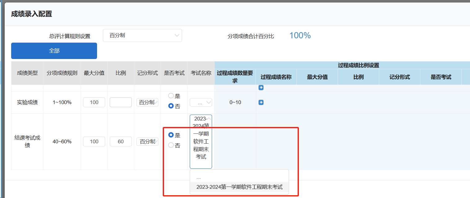 (3)过程成绩:点击添加过程成绩,先下拉选择过程成绩名称,填写各类过程成绩占比,占比之和需要等于过程成绩总占比,选择记分形式、是否考试和考试名称。点击后方的