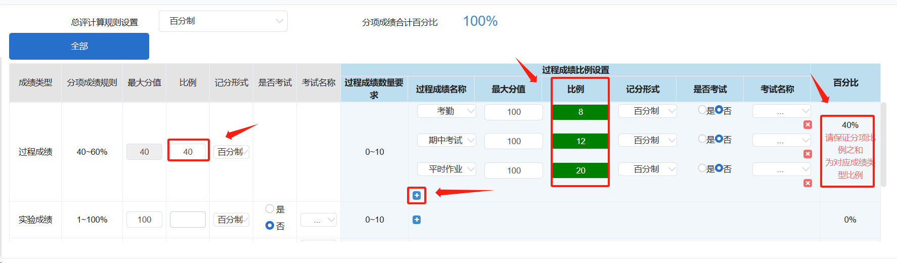 例:过程成绩占比40%,比例录入“40”后,过程成绩的最大分值会计算为“40”。