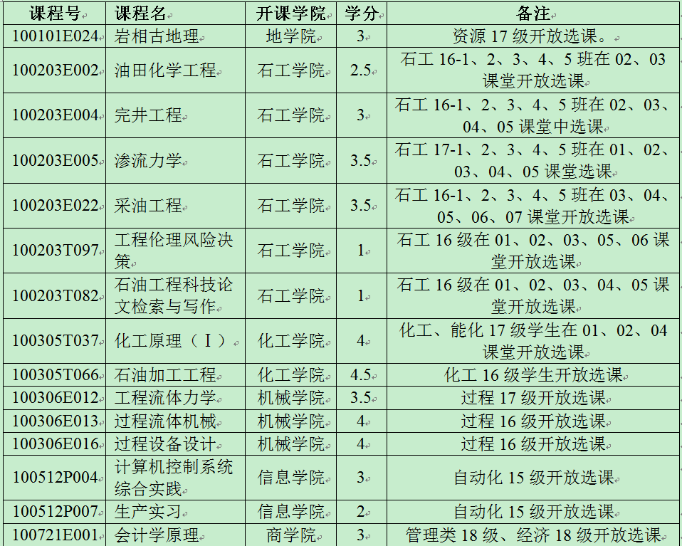 表一:2018-2019学年第二学期(春)开放式选课类课程一览