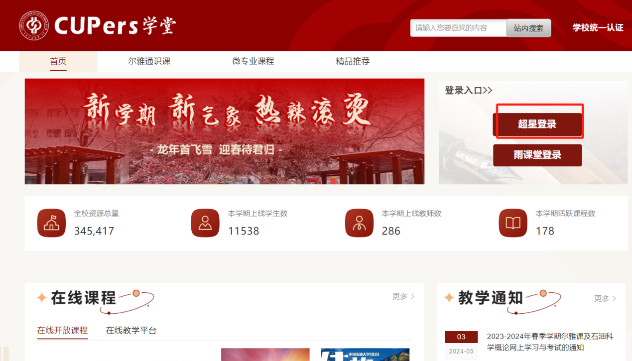 2.使用中国免费靠逼视频(北京)网络学习平台,进入CUPers学堂(http://cup.fy.chaoxing.com/),选择“超星登录”,点击“新用户注册”,输入手机号获取验证码,并设置登录密码,然后点击下一步进入完善信息界面,输入学号和真实姓名,点击下一步完成注册登录,然后进入个人空间。后续登录可以选择手机号+密码或者手机号+验证码的方式登录。