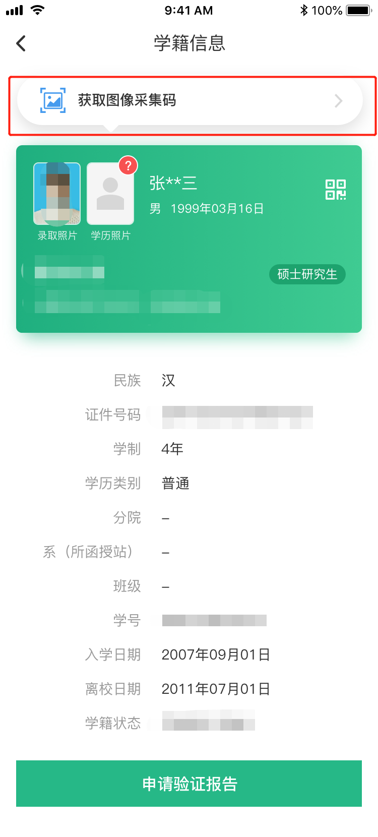 获取采集码时请同时核对学信网中个人信息,若个人身份信息存在不一致的情况请与教务处联系(010-89739131)。
