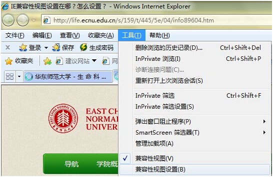 一、IE8,IE9,IE10,在IE窗口下按下“F10”按钮后,顶端处会出现工具栏,点击“工具-兼容性视图设置” , 将综合教务系统的网址:"http://202.204.193.215/"添加入列表即可。