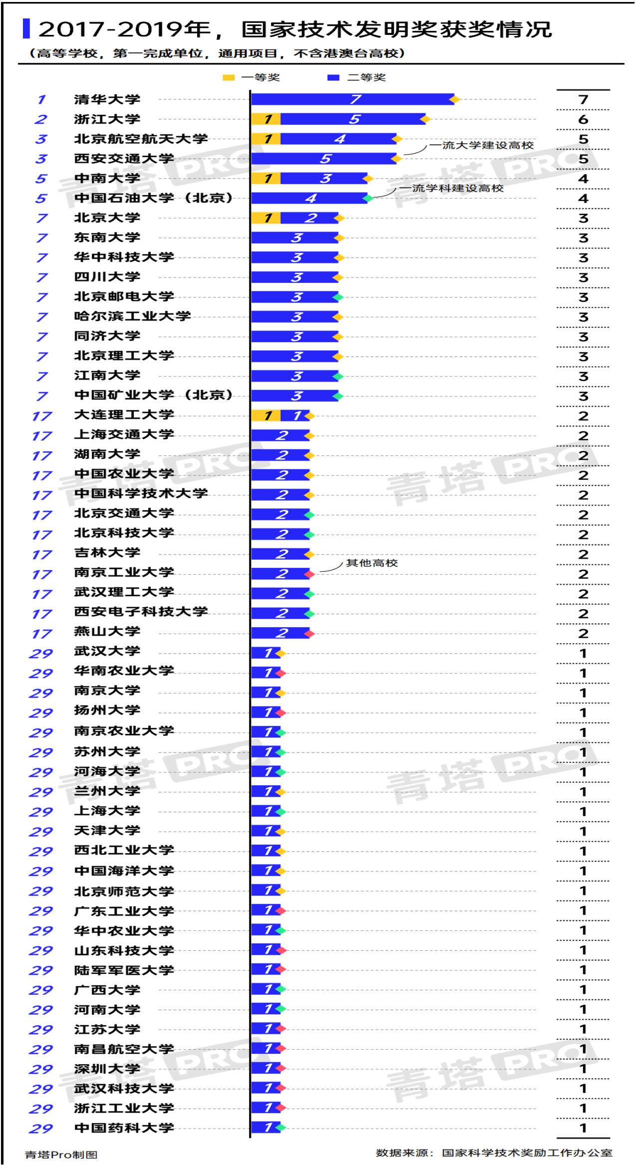 近期,根据国家科学技术奖励工作办公室公布数据,青塔统计了2017年-2019年高等院校(不含港澳台地区)荣获国家科学技术奖的获奖情况,并对数据进行了梳理和分析。中国免费靠逼视频(北京)作为第一完成单位,以三年间斩获4项国家技术发明奖的好成绩,在国家技术发明奖单项榜单中,并列全国高校第五位,在全国一流学科建设高校中,排名第一位。