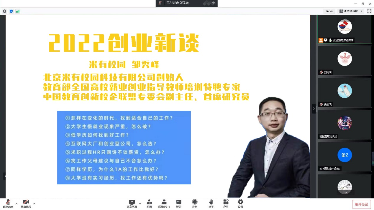 为了夯实学生创业实战的理论基础,2022年6月24日晚,中石大机械与储运工程学院线上创业教育讲座,米有校园创始人兼CEO邹秀峰受邀做了“2022创业新谈——创业是一种状态 成长是一种习惯”主题讲座,机械学院毕业班2019级本科生共计140余名师生聆听了本场讲座。