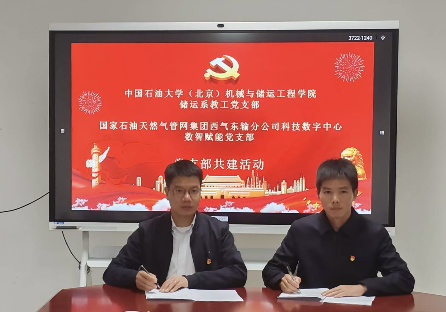 会上,机械与储运工程学院党委书记王玮首先发表致辞,热烈欢迎西气东输分公司中心数智赋能党支部来学院开展党建共建,介绍了学院基本情况。随后,西气东输数字中心郭磊所长发表了讲话,介绍了西气东输分公司科技数字中心的基本情况、发展战略和技术需求;储运系教工党支部书记孙旭汇报了支部建设情况,提出了支部共建计划;数智赋能党支部书记王磊磊介绍了支部情况。然后,双方支部参会人员围绕未来支部共建、业务交流和合作、人才培养等内容进行深入研讨和交流。最后,储运系教工党支部书记孙旭和数智赋能党支部书记王磊磊代表双方签署了党支部共建协议。