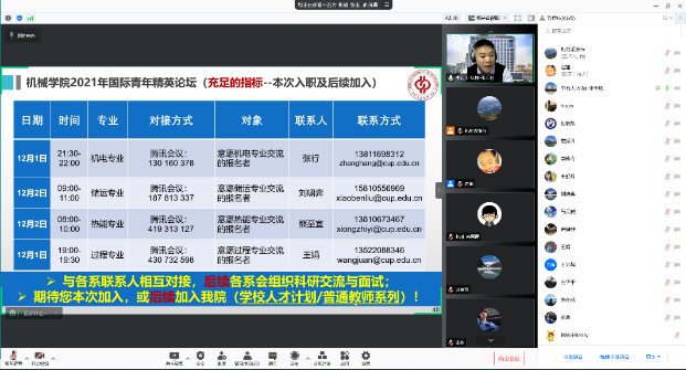 随后,机电、储运、热能、过程四个专业分别与参会的青年学者在线开展了子论坛,针对大家关心的招聘流程、进人政策、人才申报、工作环境、发展途径等问题进行了深入交流与互动。子论坛由各系负责人才引进的系主任主持,各系优秀教师代表参加。