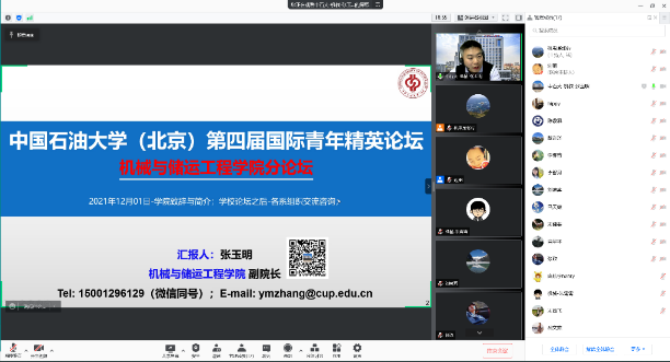 2021年12月1-2日,机械与储运工程学院在线成功举办第四届国际青年精英分论坛,来自美国、加拿大、英国、法国、日本、澳大利亚等8个国家的14名青年才俊在线参加,各专业系主任及优秀教师代表云聚交流,论坛由副院长张玉明主持。