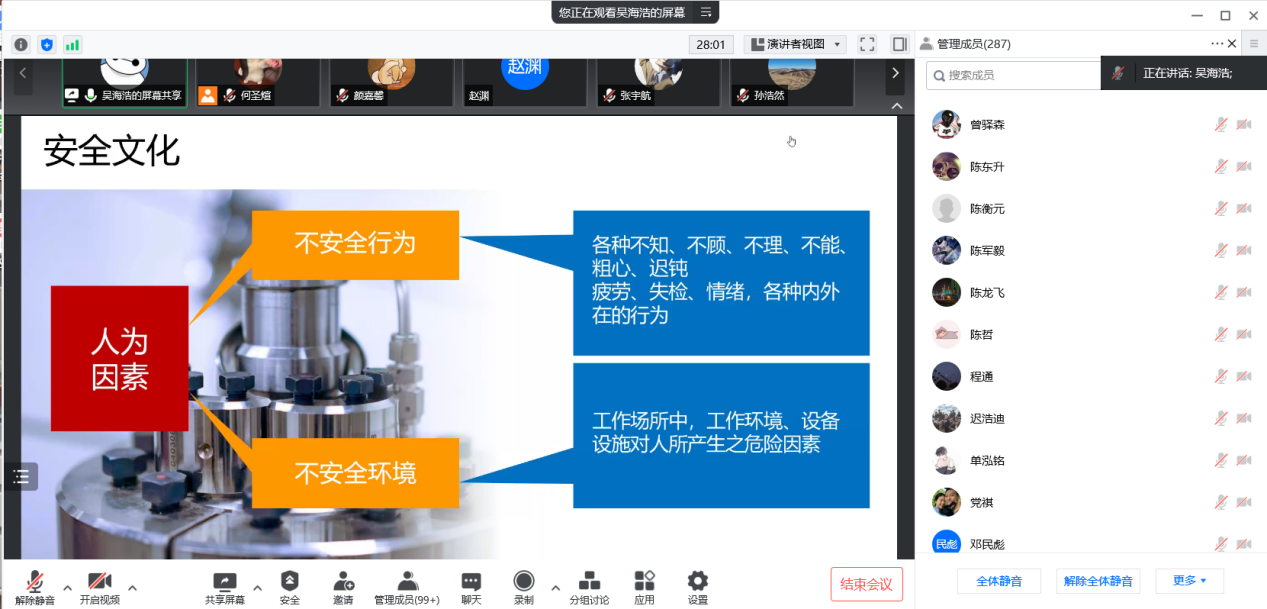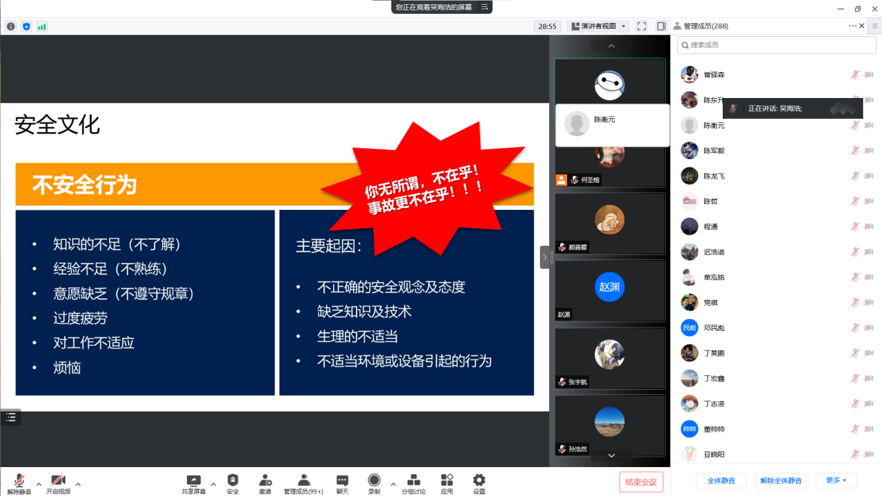 活动中,学院副院长左丽丽、实验室管理资深教师吴海浩,辅导员何圣煊组织300余名学生以线上主题教育的形式,通过分享实验室安全教育实例、观看安全教育短片、讲解实验室安全常识等形式,从“安全文化”中的“不安全行为”“不安全环境”等多方面列举了安全事故的危险性,并根据存在的安全问题提出了解决的方案以及防范的措施,呼吁学生提高实验室安全意识,愉快安全的度过大学生活。