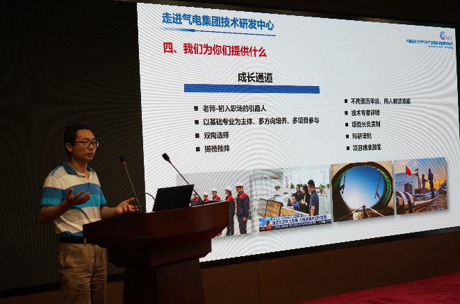 随后,气电集团技术研发中心液化总师刘淼儿向学院师生介绍了气电集团技术研发中心情况,深入阐述了研发中心的组织机构、人员配置情况以及战略定位、核心研发方向、重点攻关项目等关键领域的技术实力与创新成果,展现了气电集团作为国家能源骨干企业在科技创新方面的雄厚实力与引领作用。