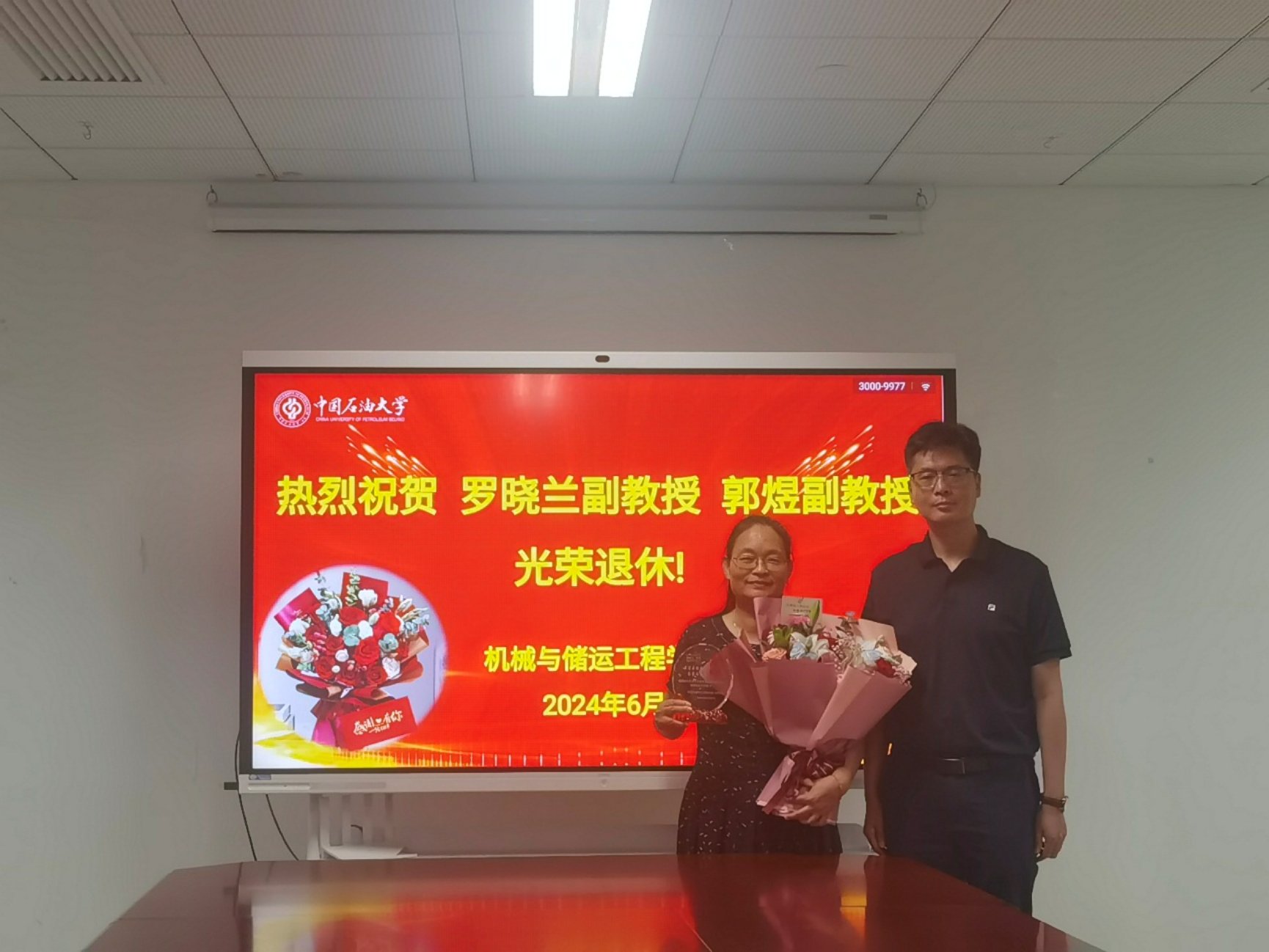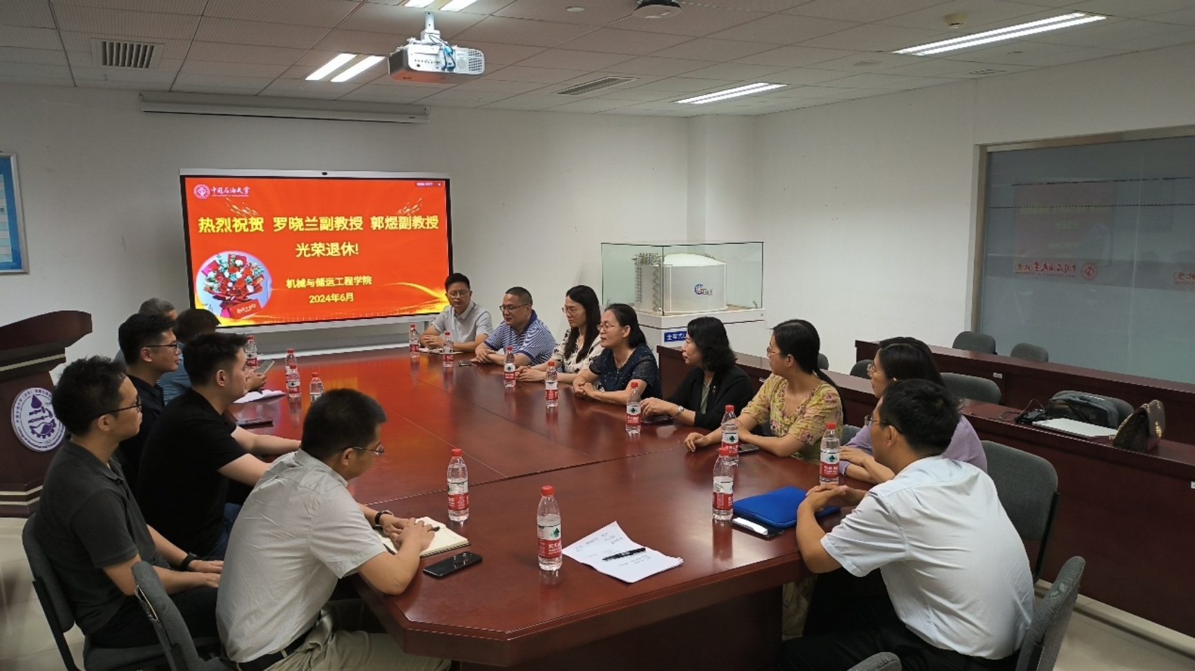 6月27日上午,机械与储运工程学院在主楼B921举办2024年上半年退休教师荣休座谈会,庆祝罗晓兰副教授和郭煜副教授光荣退休。机械学院党委书记闫亮亮,副院长张玉明、张行,机电系、能动系部分教师代表参加了本次座谈会,会议由工会主席彭鹤主持。
