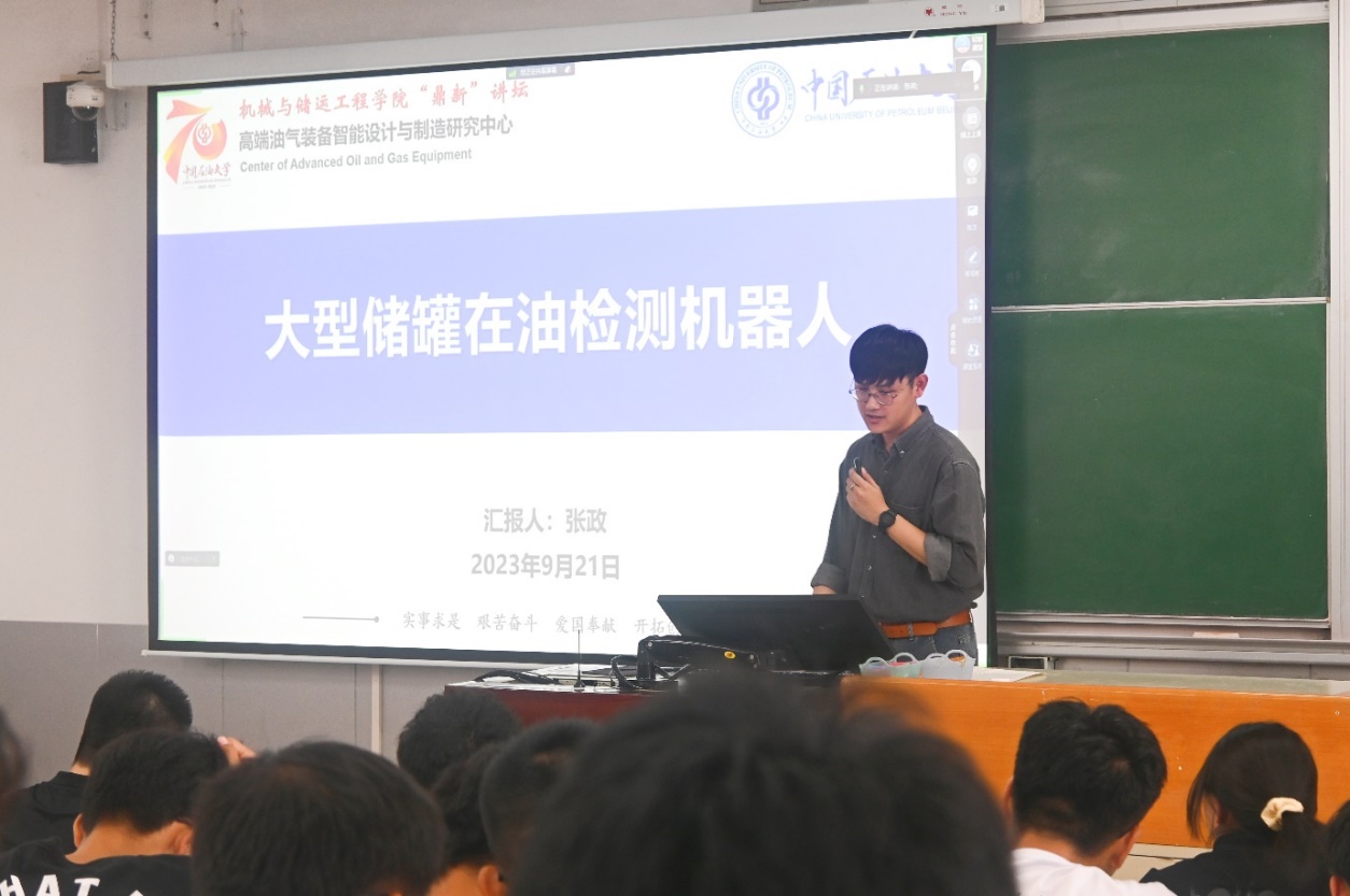 会上,贾晓丽教授首先对论坛进行了介绍,希望大家能够通过本次论坛,加深对专业的理解。随后丁建中副教授做了题为“航天梦想,石油助力”的精彩报告,报告中,丁建中老师详细介绍了在我国航天器设计中的机构学研究成果。随后,王暾、张政、朱霄霄,依次进行了各自研究领域的学术报告,主题分别为“基于机构智能的机器人设计与分析”,“大型储罐在油检测机器人”和“油气管道智能封堵机器人”。学院机械设计制造及其自动化和机器人工程专业大一到大四的本科生约300余人认真聆听了所有报告,并就相关感兴趣的问题,与各位老师进行了深入的交流。