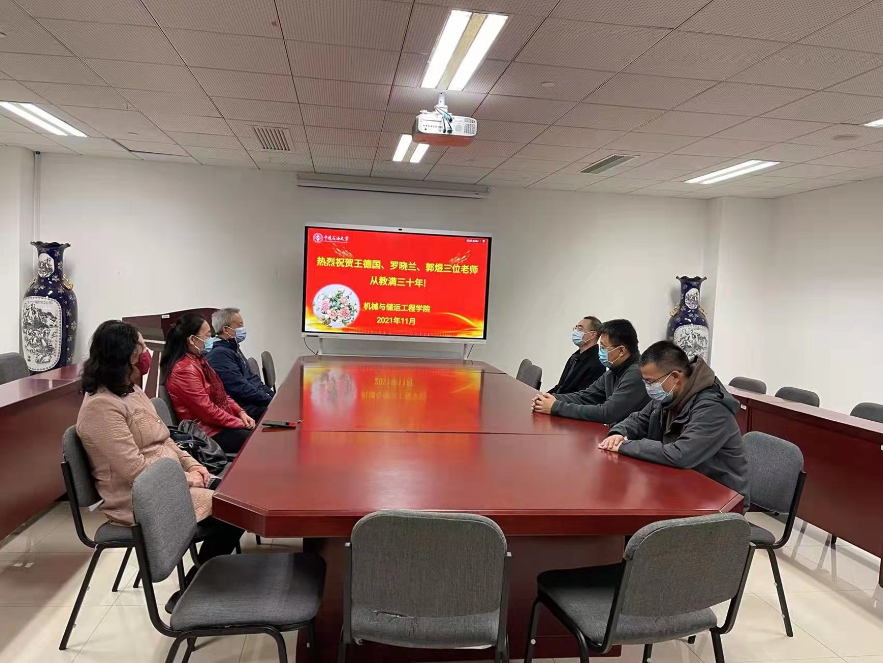 11月5日上午,机械与储运工程学院党委书记李光和、工会主席彭鹤以及工会委员张行,代表学院和工会,在主楼B921与从教满30年的王德国、罗晓兰和郭煜三位老师座谈交流。