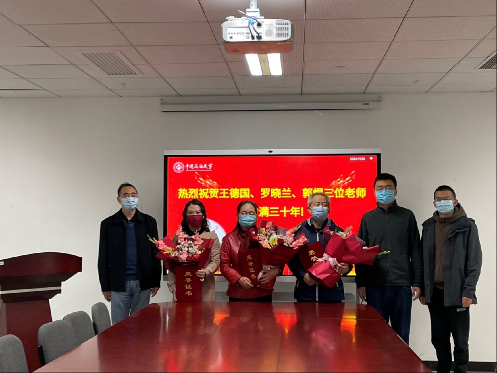 李光和代表学院向王德国、罗晓兰和郭煜老师从教满30年表示祝贺,感谢他们为专业建设和学院发展做出的突出贡献,为他们颁发了荣誉证书和鲜花,希望三位老师继续站好三尺讲台,培养更多优秀人才,为教育事业贡献力量,为青年教师树立榜样。