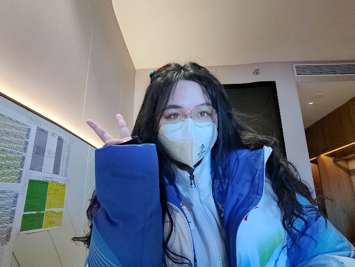 2022年北京冬奥会期间,她在延庆冬奥村里担任人事助理。主要负责收集、整理和汇总各类工作人员档案,为工作人员设计节日祝福和日常激励,还负责了物资的发放、考勤等事务性工作。