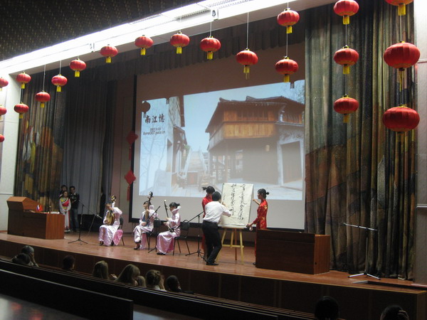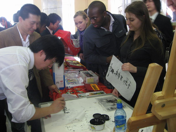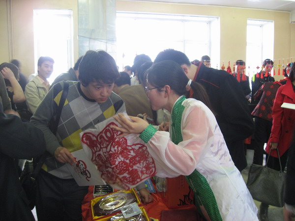 艺术品展台展示拉开了此次活动的序幕。展台上,中国结、剪纸画、手工艺术品、书法、国画作品、奥运福娃等充满浓郁中国特色的各样民俗艺术品,琳琅满目,吸引了众多师生驻足观看欣赏。现场书法表演,更是让学生留恋往返,纷纷要求写字留念,展现了中华文字的独特的吸引力,展台前着有民族服装的中国学生一一给外国师生细心讲解,同学们对于这些富有中国特色的艺术品表现出极大的兴趣。现场人头攒动,气氛极其浓烈。