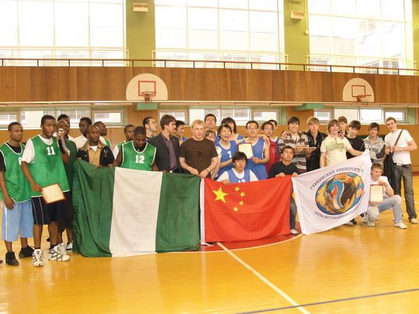 我校留俄学生作为参赛主力,团结全校中国留学生参加了跑步、足球、篮球、飞镖、乒乓球、排球等多个比赛项目。我校07级留学生付玉璞和06级留学生赵明击败校队专业选手,分别获得女子飞镖、男子乒乓球的单项冠军,男子篮球战胜强大的俄罗斯队获团体冠军。当颁奖仪式上奏起雄伟的《义勇军进行曲》时,全体同学高唱国歌,表达着对祖国的热爱和祝福。
