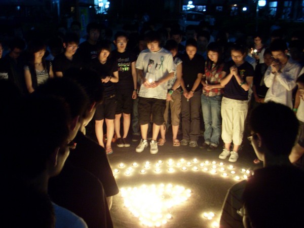 21日晚十时,校学生会又联系四川同学会组织进行了以四川同学为主的“点燃蜡烛,温情传递”的激励活动。到场同学点燃了心型的蜡烛,共同默哀、祈福,愿逝者安息,生者坚强。四川的同学在活动过程中一一说出了自己的心声并相互勉励。最后大家高唱国歌,高喊“四川雄起,中国加油!”。活动后,不少同学围聚在蜡烛周围久久不愿散去。